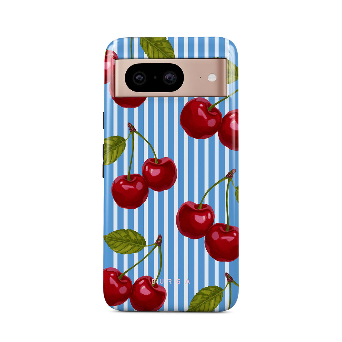 Cherries dangle like earrings from blue skies, a fun reminder of that first bite of summer, juicy and bursting with laughter. Meet our Sweet Moment Google Pixel 8 phone case design.