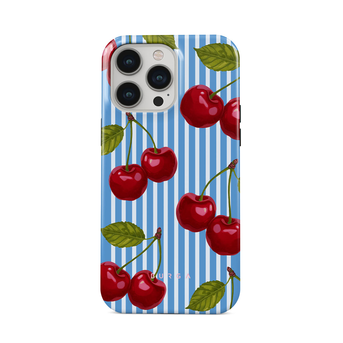 Cherries dangle like earrings from blue skies, a fun reminder of that first bite of summer, juicy and bursting with laughter. Meet our Sweet Moment iPhone 13 Pro phone case design.