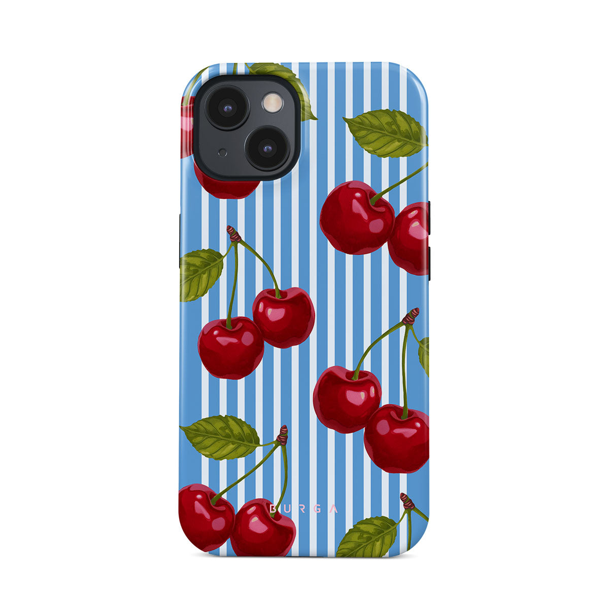 Cherries dangle like earrings from blue skies, a fun reminder of that first bite of summer, juicy and bursting with laughter. Meet our Sweet Moment iPhone 14 phone case design.