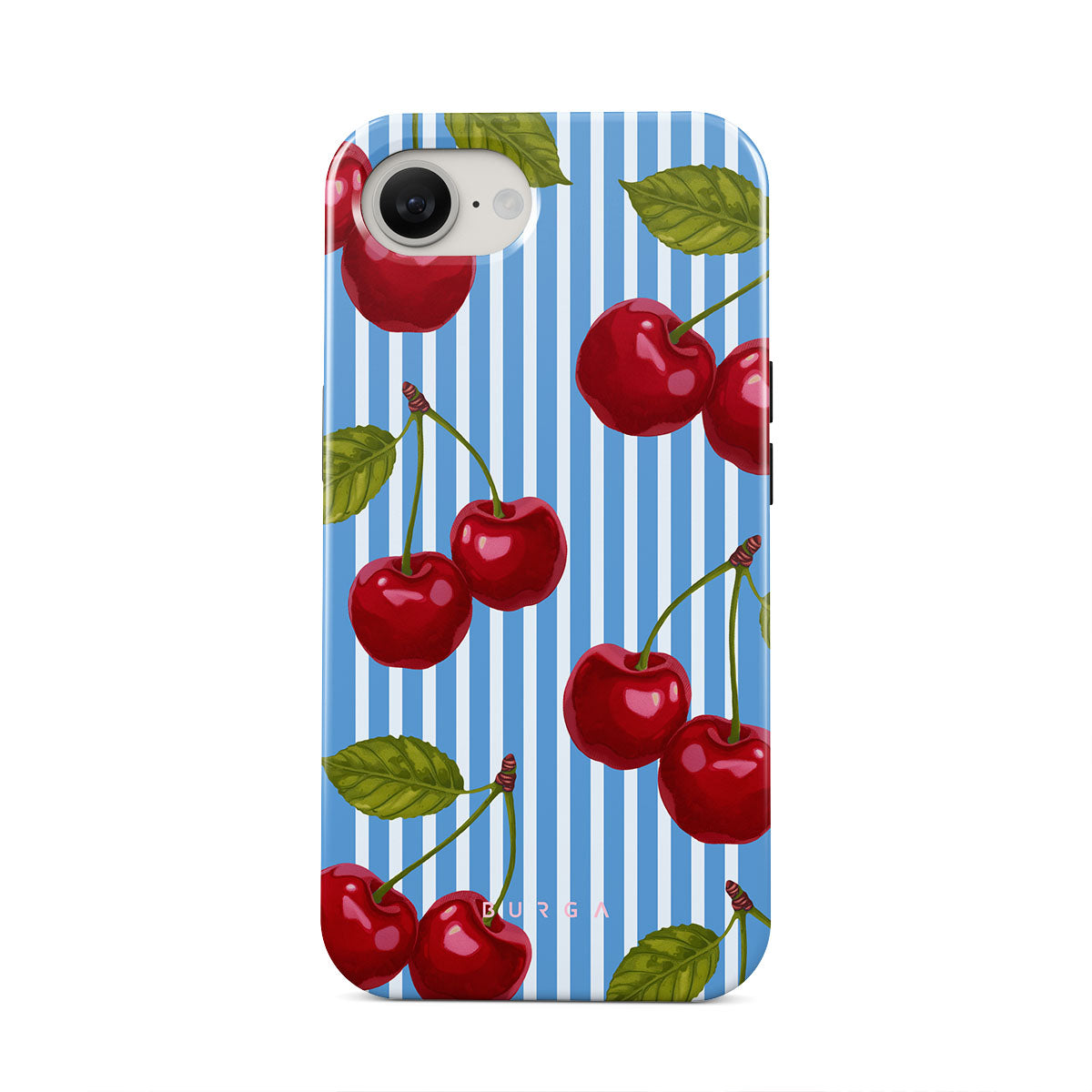 Cherries dangle like earrings from blue skies, a fun reminder of that first bite of summer, juicy and bursting with laughter. Meet our Sweet Moment iPhone 16e phone case design.