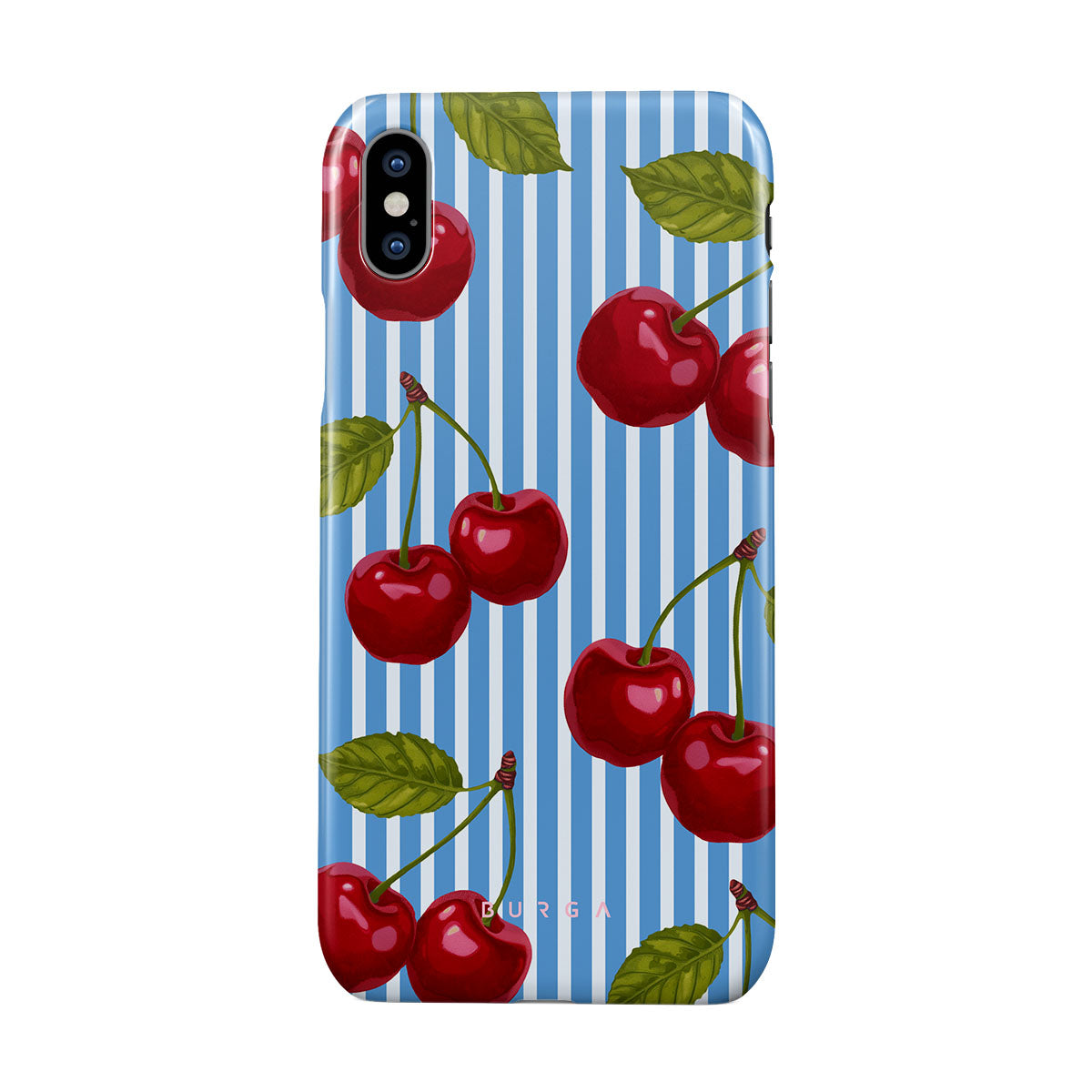 Cherries dangle like earrings from blue skies, a fun reminder of that first bite of summer, juicy and bursting with laughter. Meet our Sweet Moment iPhone X / XS phone case design.