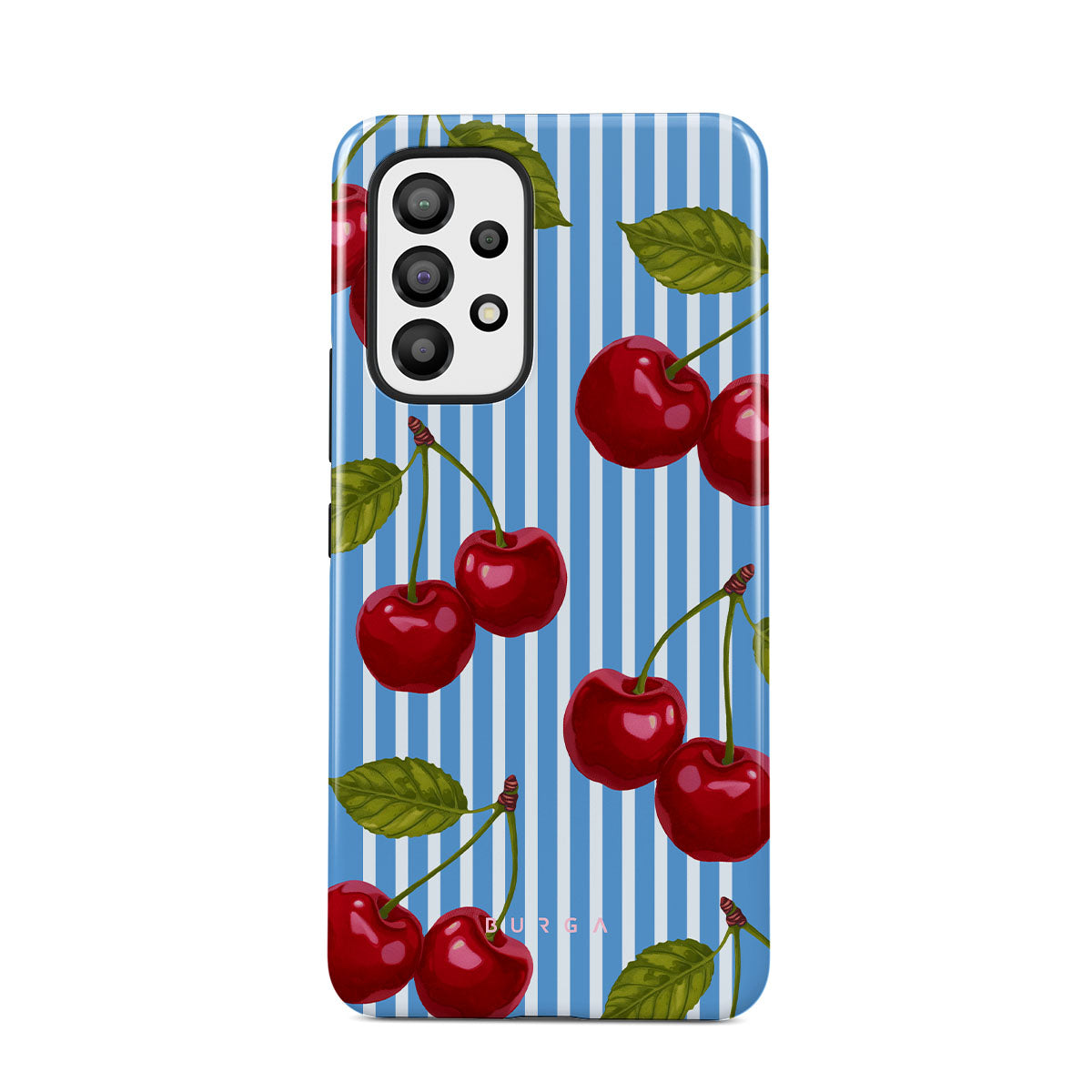 Cherries dangle like earrings from blue skies, a fun reminder of that first bite of summer, juicy and bursting with laughter. Meet our Sweet Moment Samsung Galaxy A53 phone case design.