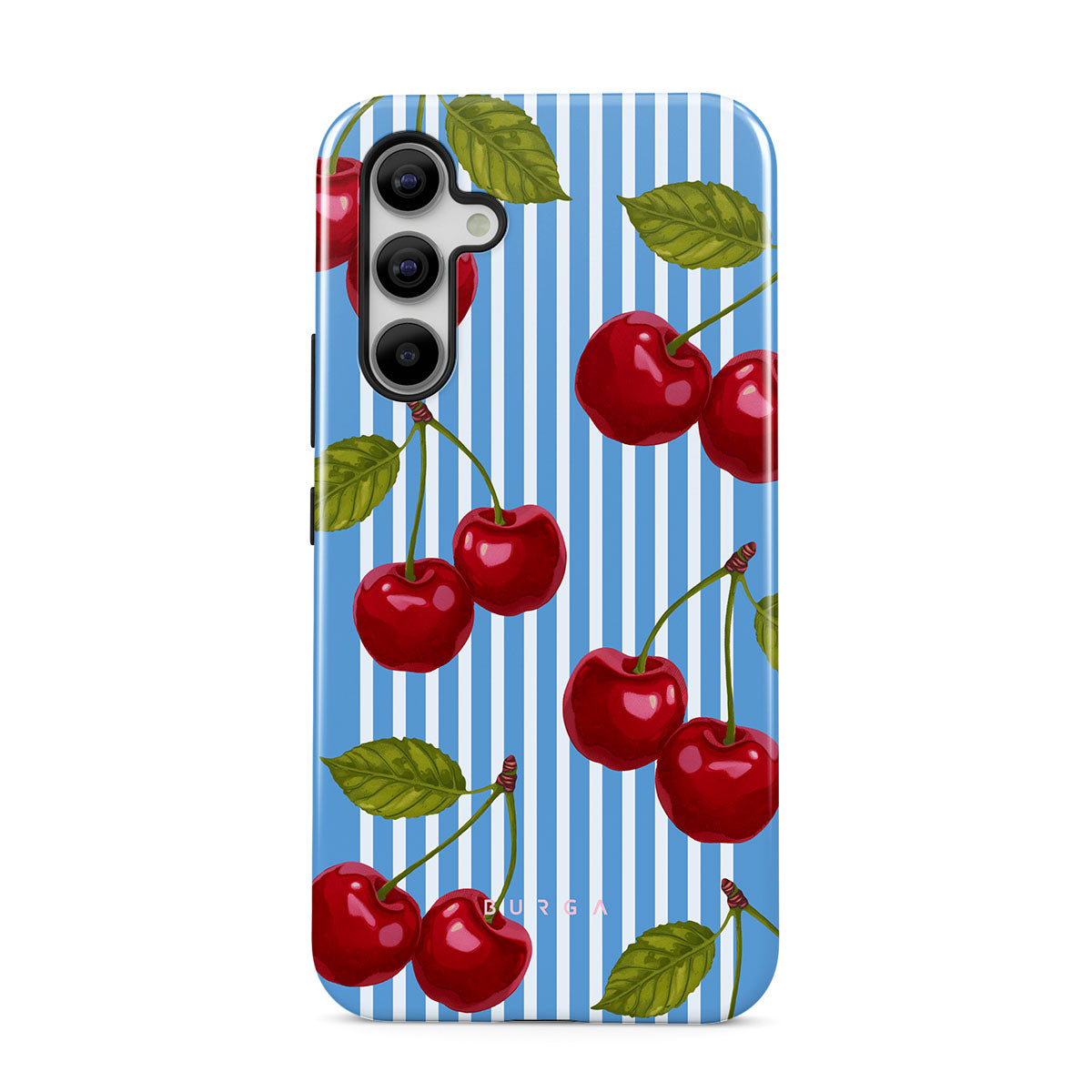 Cherries dangle like earrings from blue skies, a fun reminder of that first bite of summer, juicy and bursting with laughter. Meet our Sweet Moment Samsung Galaxy A55 phone case design.