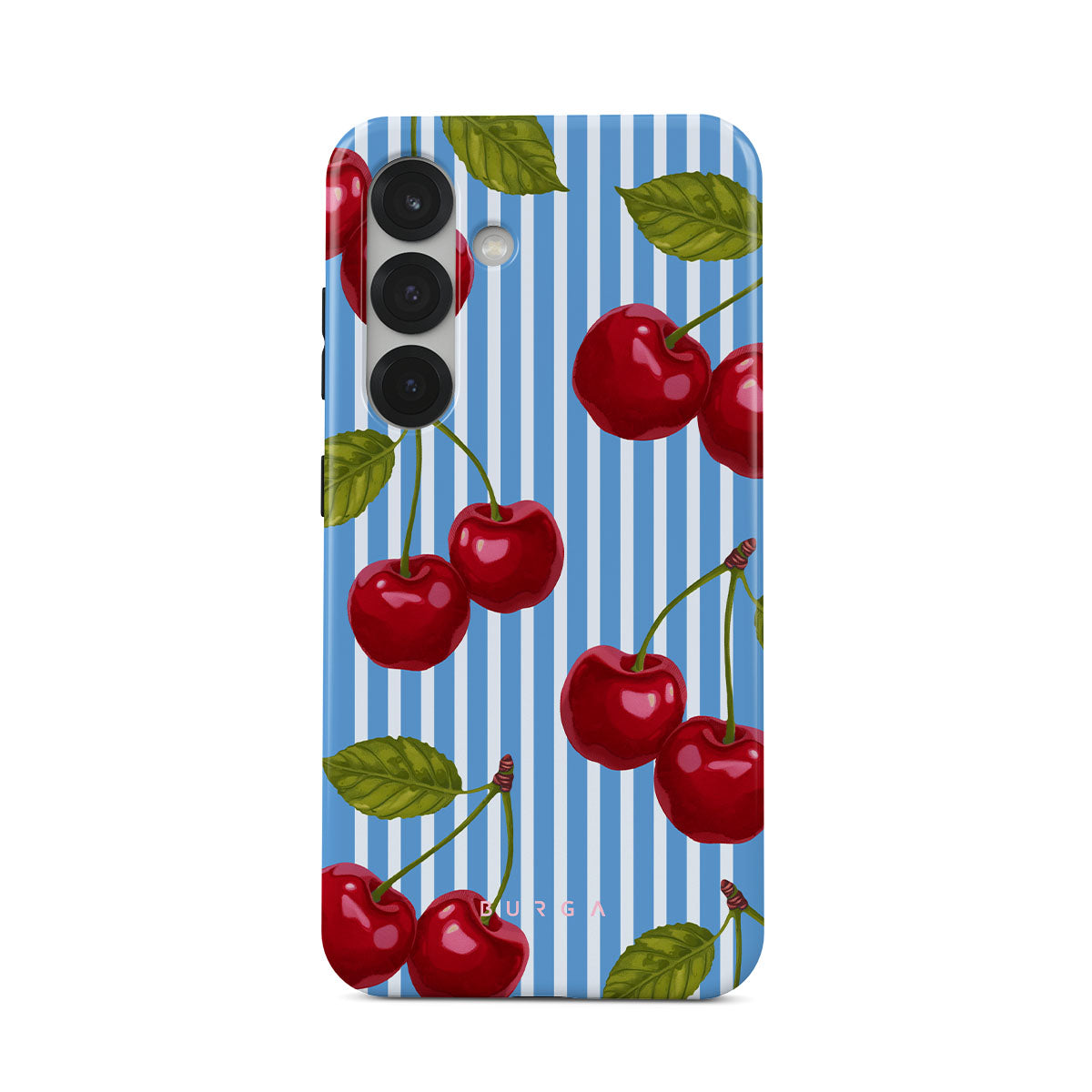 Cherries dangle like earrings from blue skies, a fun reminder of that first bite of summer, juicy and bursting with laughter. Meet our Sweet Moment Samsung Galaxy S25 phone case design.