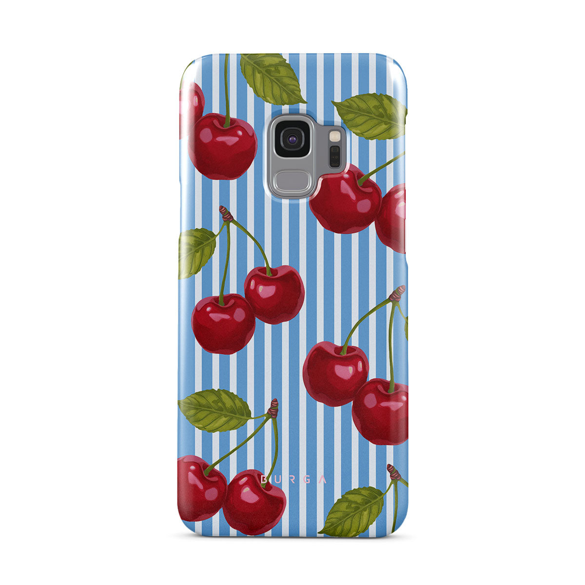 Cherries dangle like earrings from blue skies, a fun reminder of that first bite of summer, juicy and bursting with laughter. Meet our Sweet Moment Samsung Galaxy S9 phone case design.