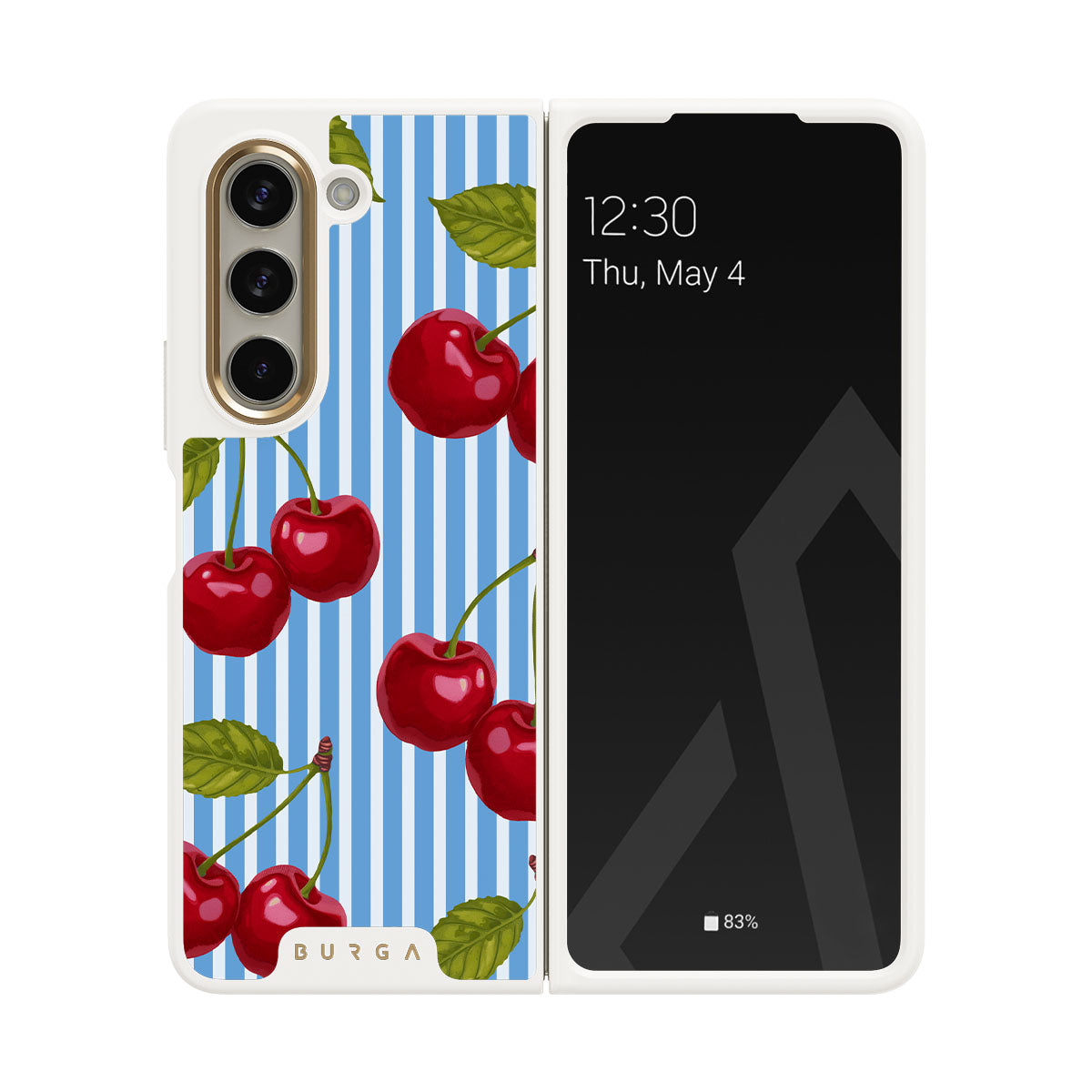Cherries dangle like earrings from blue skies, a fun reminder of that first bite of summer, juicy and bursting with laughter. Meet our Sweet Moment Samsung Galaxy Z Fold 5 phone case design.
