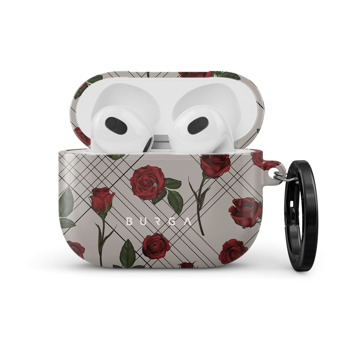 Embrace the subtle rebellion of our Sweet Sin Apple Airpods 3 case cover design. On a muted nude-gray canvas, scattered small red roses hint at passions hidden beneath the surface. A design that balances the delicate with the daring. Crafted for those who find beauty in the unexpected and wear their edge with elegance.