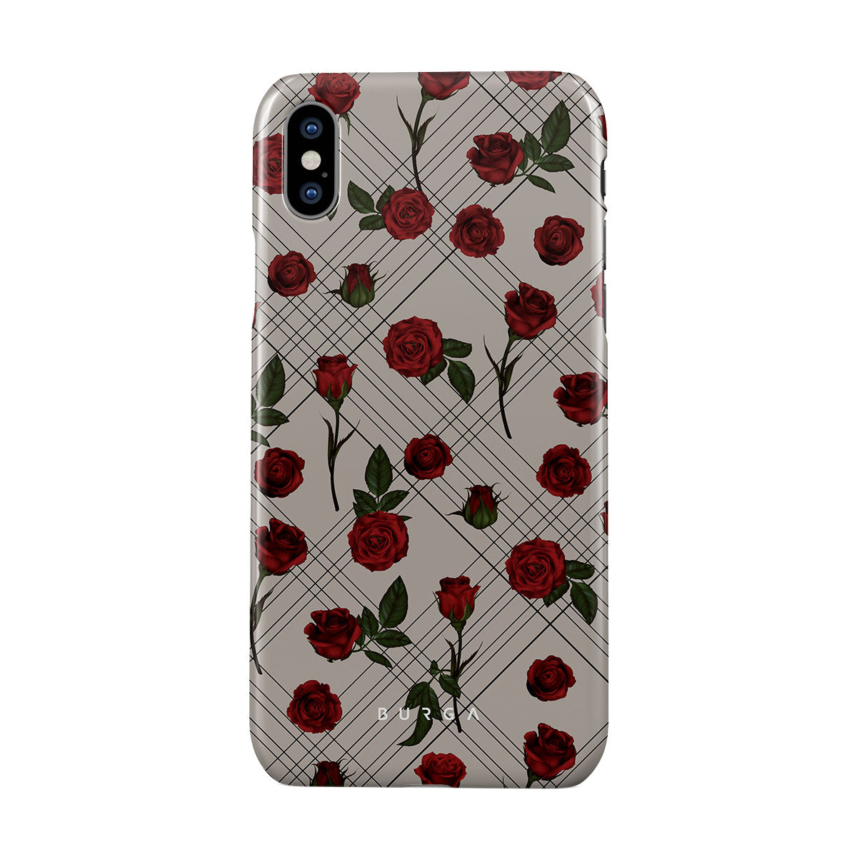 Embrace the subtle rebellion of our Sweet Sin iPhone X / XS phone case design. On a muted nude-gray canvas, scattered small red roses hint at passions hidden beneath the surface. A design that balances the delicate with the daring. Crafted for those who find beauty in the unexpected and wear their edge with elegance.