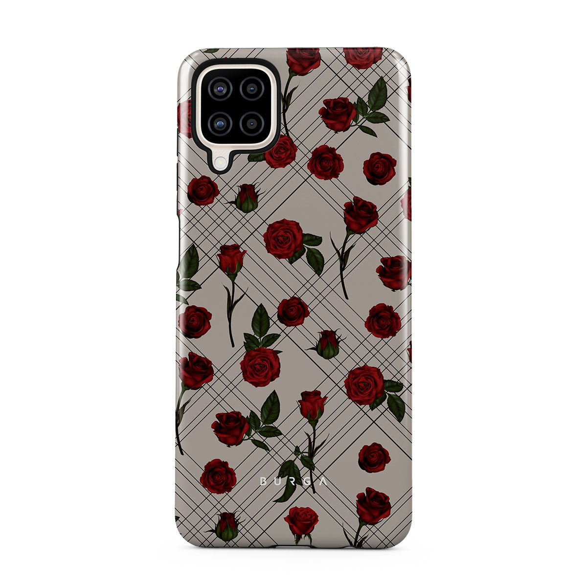 Embrace the subtle rebellion of our Sweet Sin Samsung Galaxy A12 4G phone case design. On a muted nude-gray canvas, scattered small red roses hint at passions hidden beneath the surface. A design that balances the delicate with the daring. Crafted for those who find beauty in the unexpected and wear their edge with elegance.