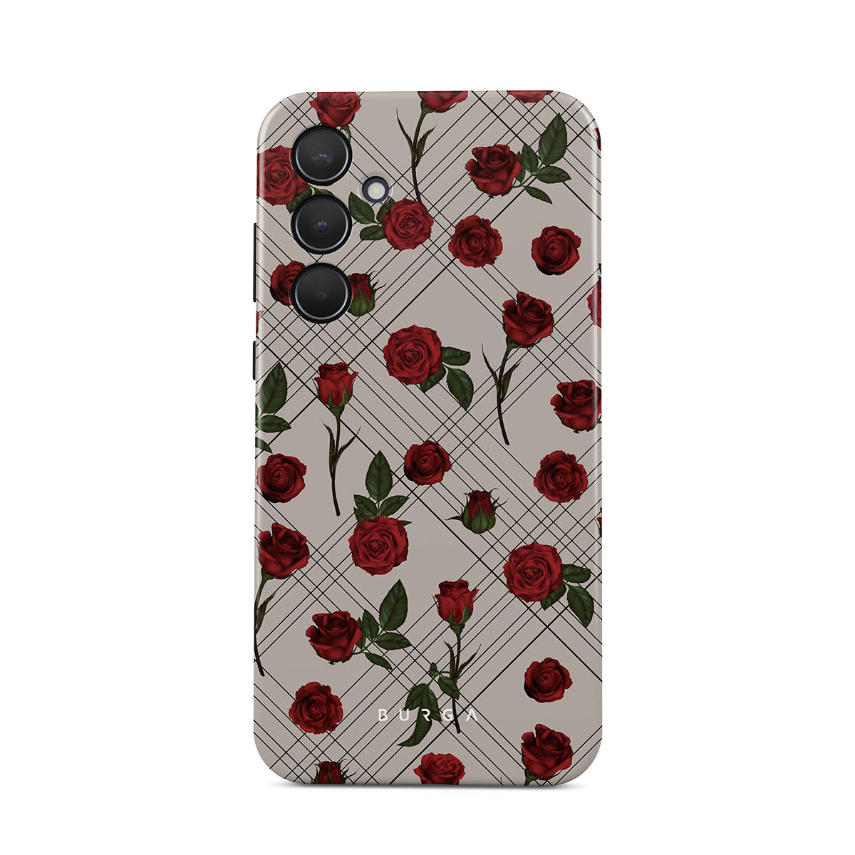 Embrace the subtle rebellion of our Sweet Sin Samsung Galaxy A35 phone case design. On a muted nude-gray canvas, scattered small red roses hint at passions hidden beneath the surface. A design that balances the delicate with the daring. Crafted for those who find beauty in the unexpected and wear their edge with elegance.