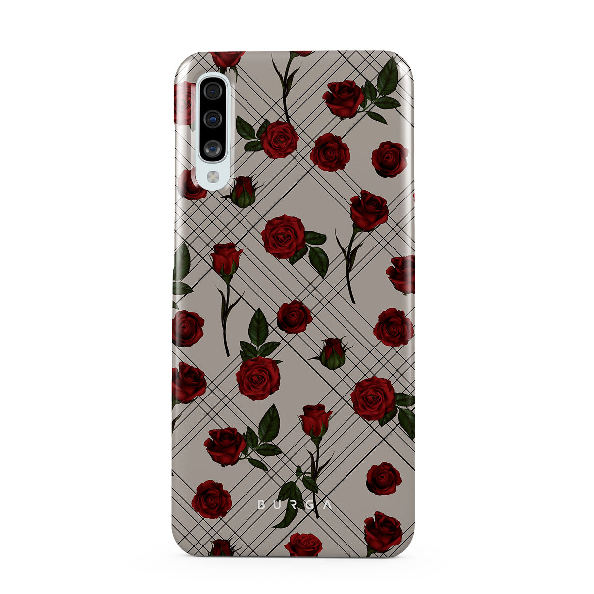 Embrace the subtle rebellion of our Sweet Sin Samsung Galaxy A50 phone case design. On a muted nude-gray canvas, scattered small red roses hint at passions hidden beneath the surface. A design that balances the delicate with the daring. Crafted for those who find beauty in the unexpected and wear their edge with elegance.