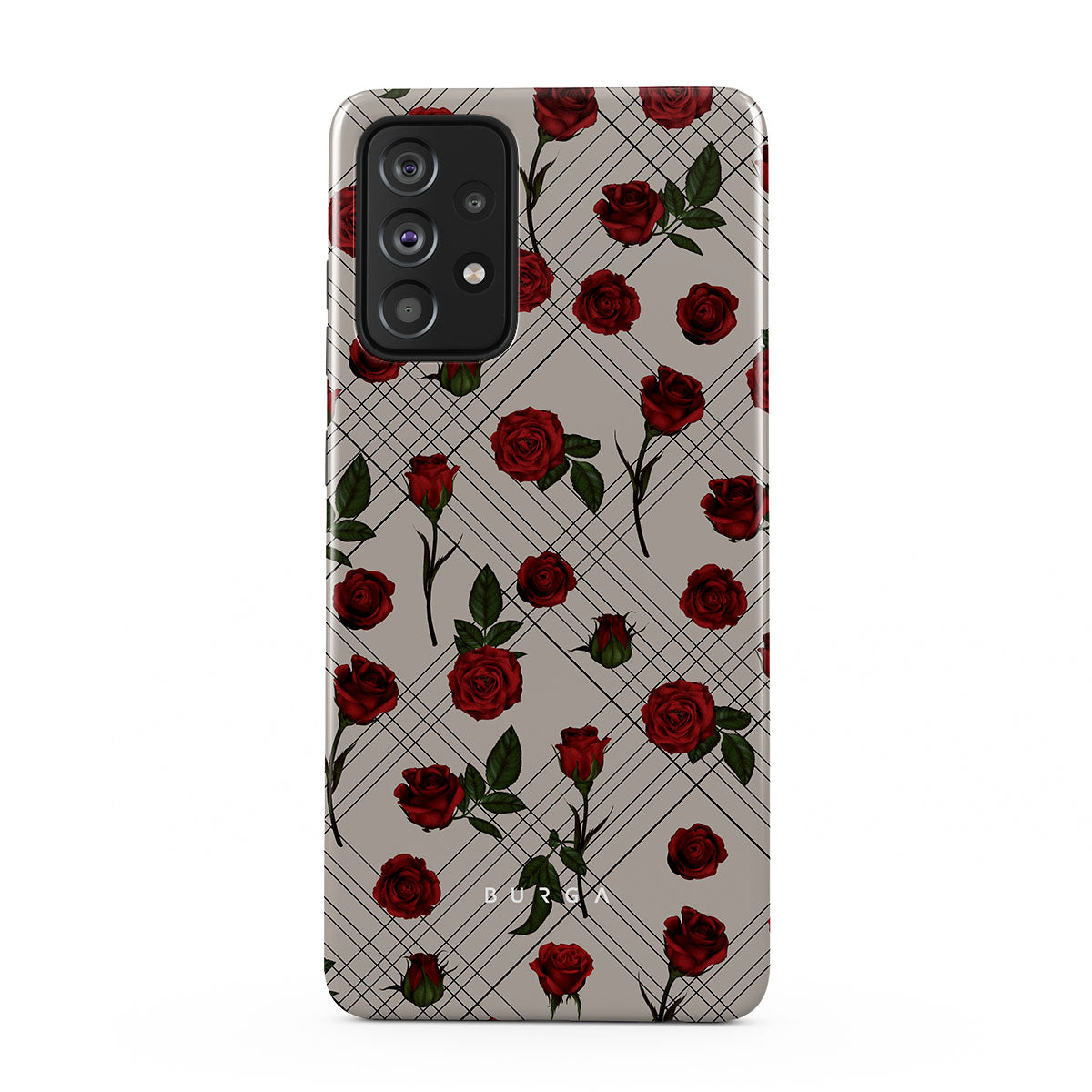 Embrace the subtle rebellion of our Sweet Sin Samsung Galaxy A52 / A52S 4G / 5G phone case design. On a muted nude-gray canvas, scattered small red roses hint at passions hidden beneath the surface. A design that balances the delicate with the daring. Crafted for those who find beauty in the unexpected and wear their edge with elegance.