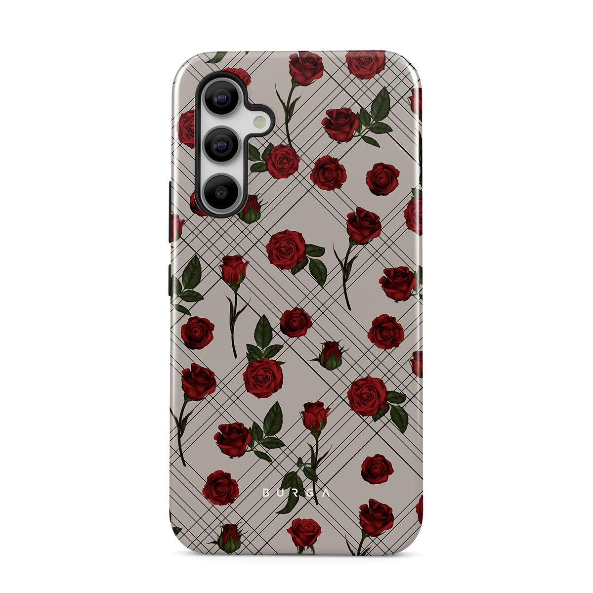 Embrace the subtle rebellion of our Sweet Sin Samsung Galaxy A55 phone case design. On a muted nude-gray canvas, scattered small red roses hint at passions hidden beneath the surface. A design that balances the delicate with the daring. Crafted for those who find beauty in the unexpected and wear their edge with elegance.
