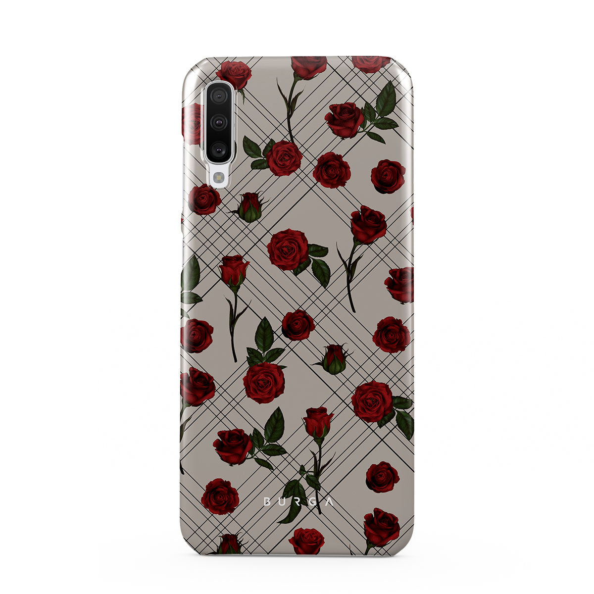 Embrace the subtle rebellion of our Sweet Sin Samsung Galaxy A70 phone case design. On a muted nude-gray canvas, scattered small red roses hint at passions hidden beneath the surface. A design that balances the delicate with the daring. Crafted for those who find beauty in the unexpected and wear their edge with elegance.