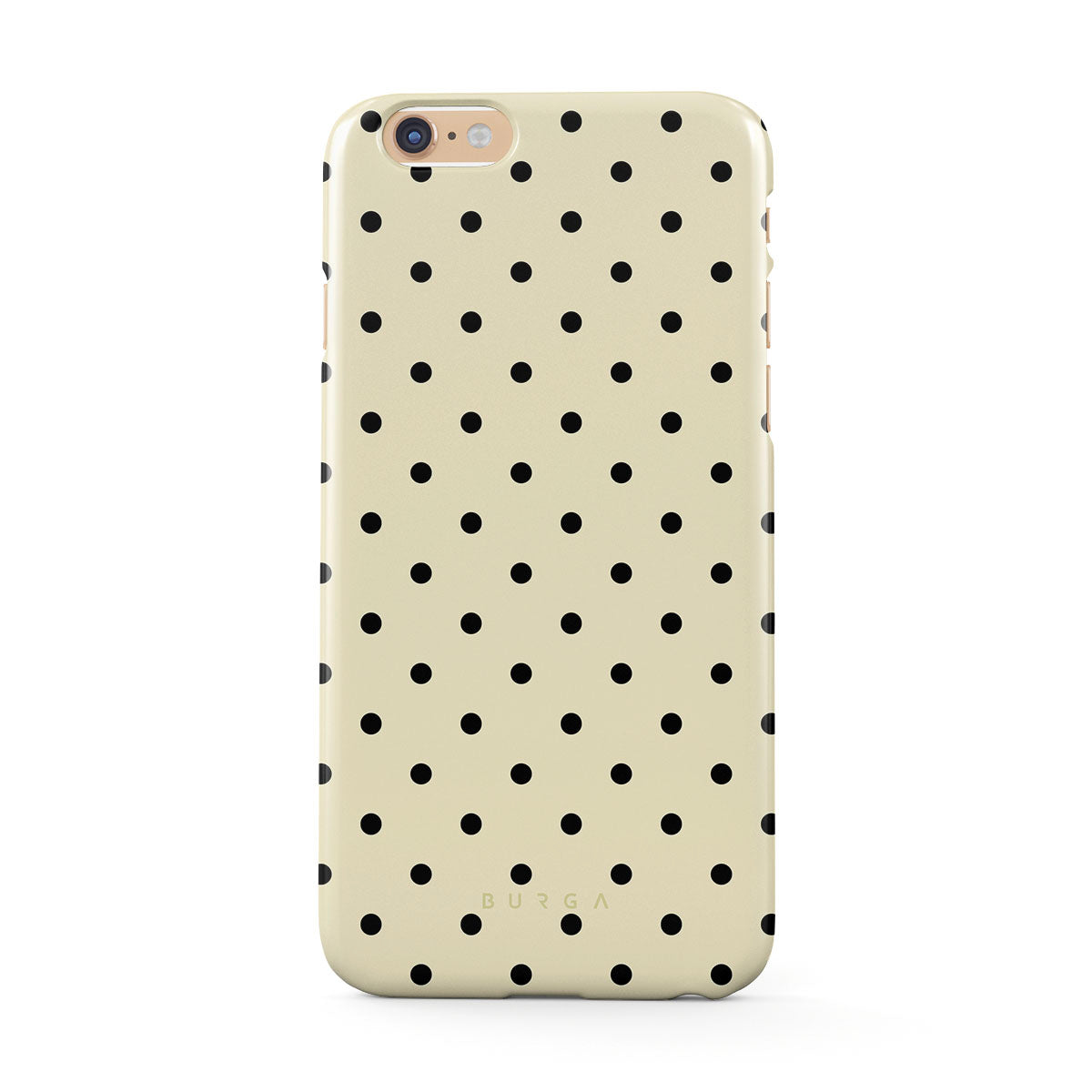 This design features: beige background with small black polka dots.