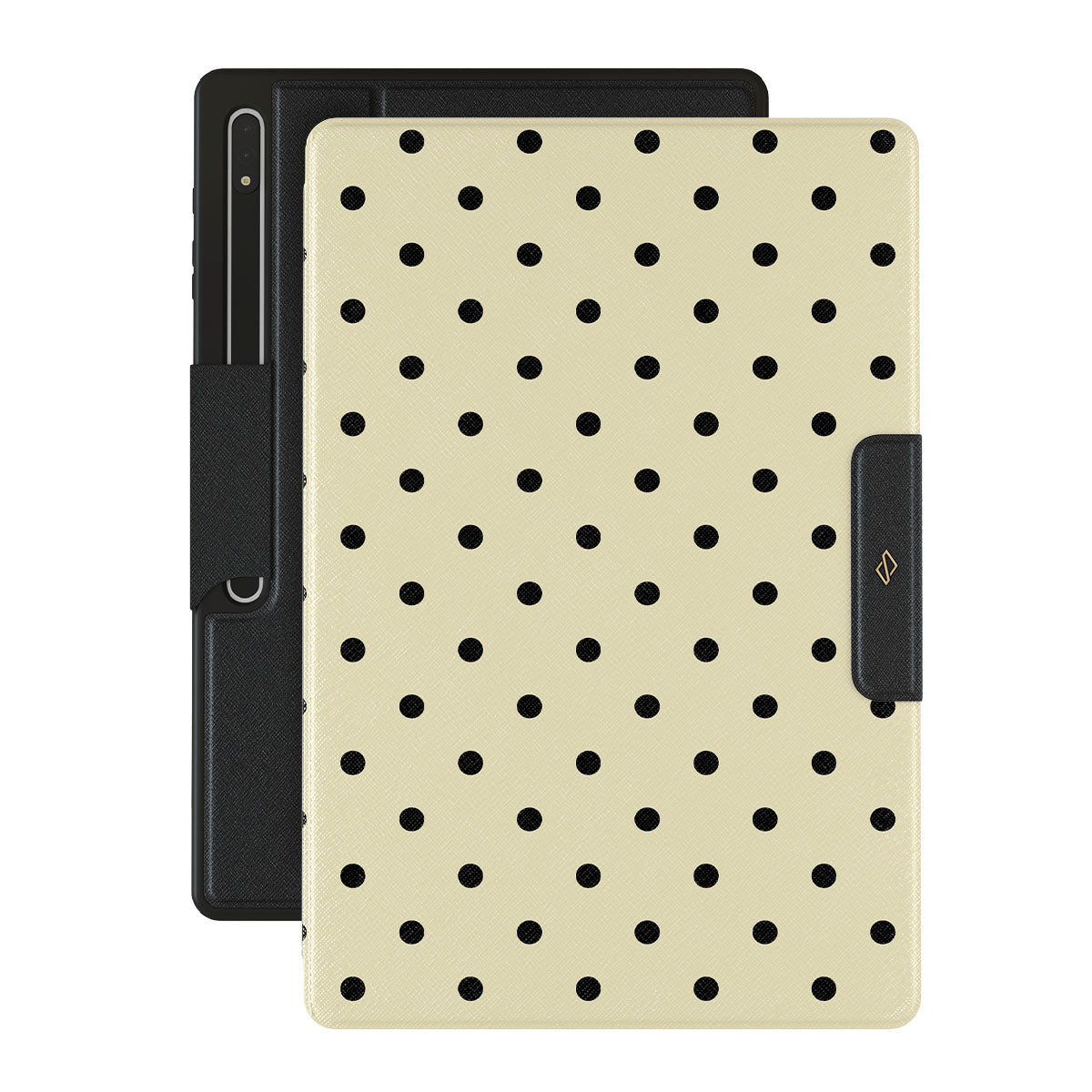 This design features: beige background with small black polka dots.