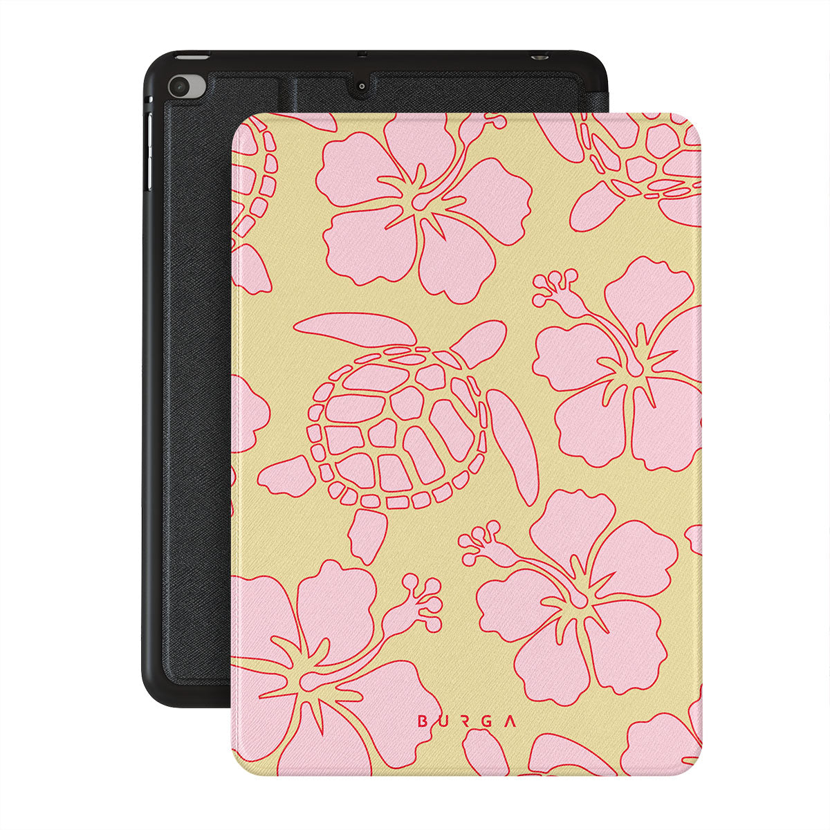 The Tan Break iPad Mini 7.9 (5th Gen) folio case features a vibrant design with pink flowers and sea turtles on a sunny yellow background. This tropical-inspired pattern exudes a laid-back, beachy vibe, perfect for those who love vibrant and nature-themed aesthetics.
