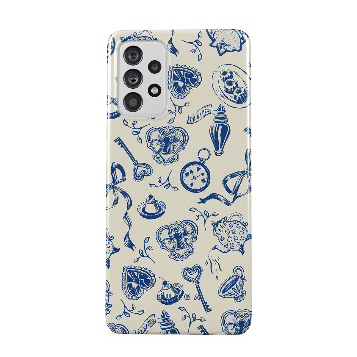 The Tea Party Samsung Galaxy A72 4G / 5G phone case design is a porcelain puzzle—ribbons tangled, time warped, rules rewritten. Sit down, pour a cup, but don’t expect things to make sense. They never do.
