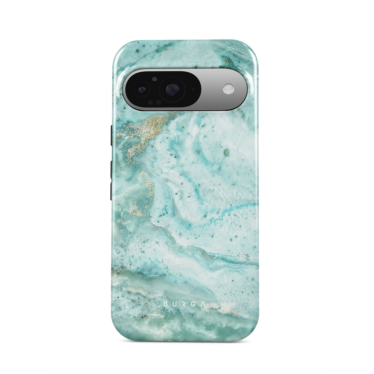 Our Uluwatu Waves Google Pixel 9 phone case is an absolute teal dream. This phone cover features timeless and soft blue marble pattern enriched with golden color specks will surely remind you of a tropical beach teal waters while becoming a protective best friend for your cell phone.