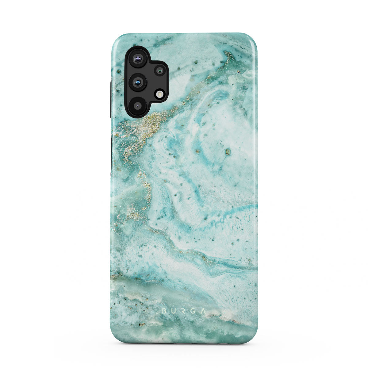 Our Uluwatu Waves Samsung Galaxy A32 5G phone case is an absolute teal dream. This phone cover features timeless and soft blue marble pattern enriched with golden color specks will surely remind you of a tropical beach teal waters while becoming a protective best friend for your cell phone.