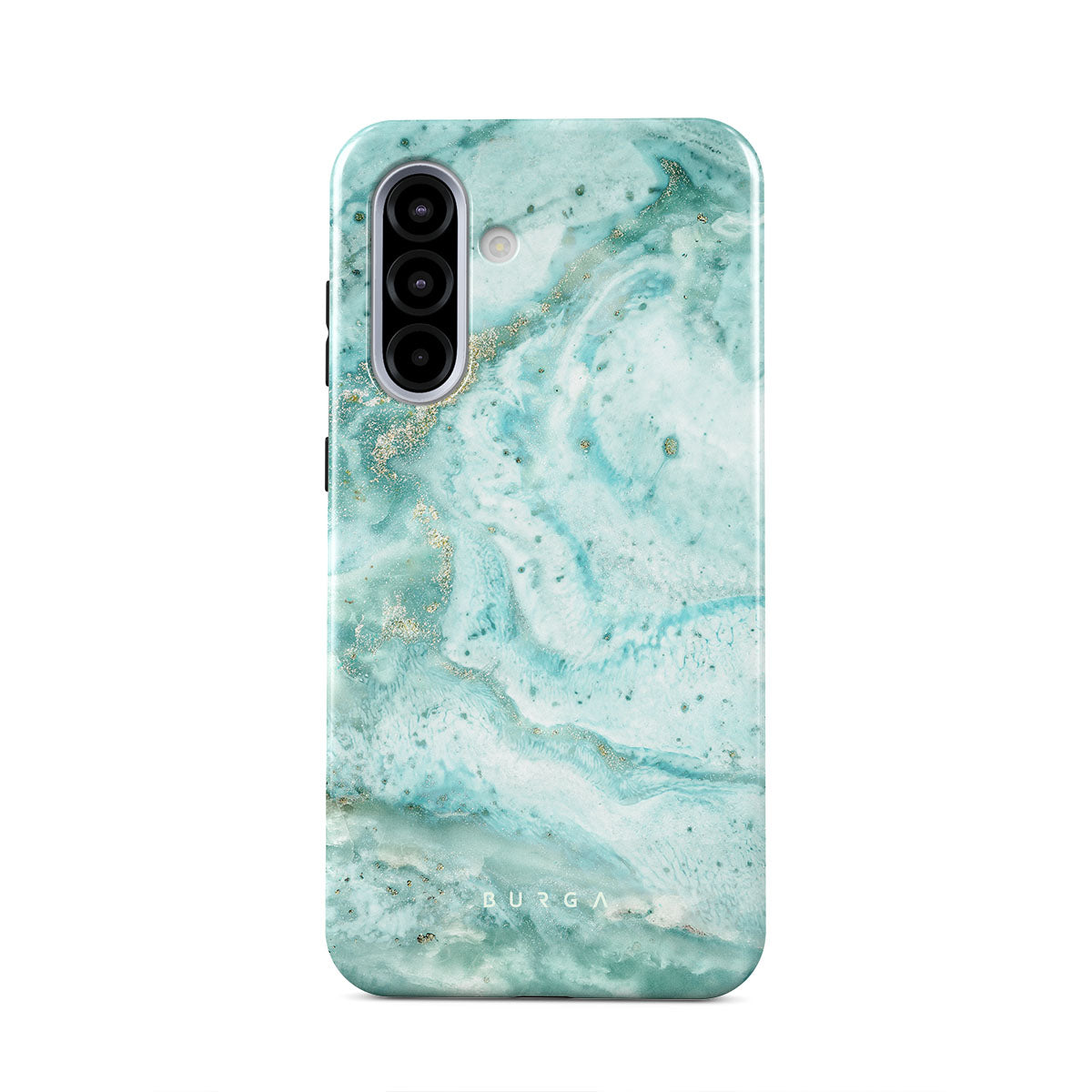 Our Uluwatu Waves Samsung Galaxy A56 5G phone case is an absolute teal dream. This phone cover features timeless and soft blue marble pattern enriched with golden color specks will surely remind you of a tropical beach teal waters while becoming a protective best friend for your cell phone.