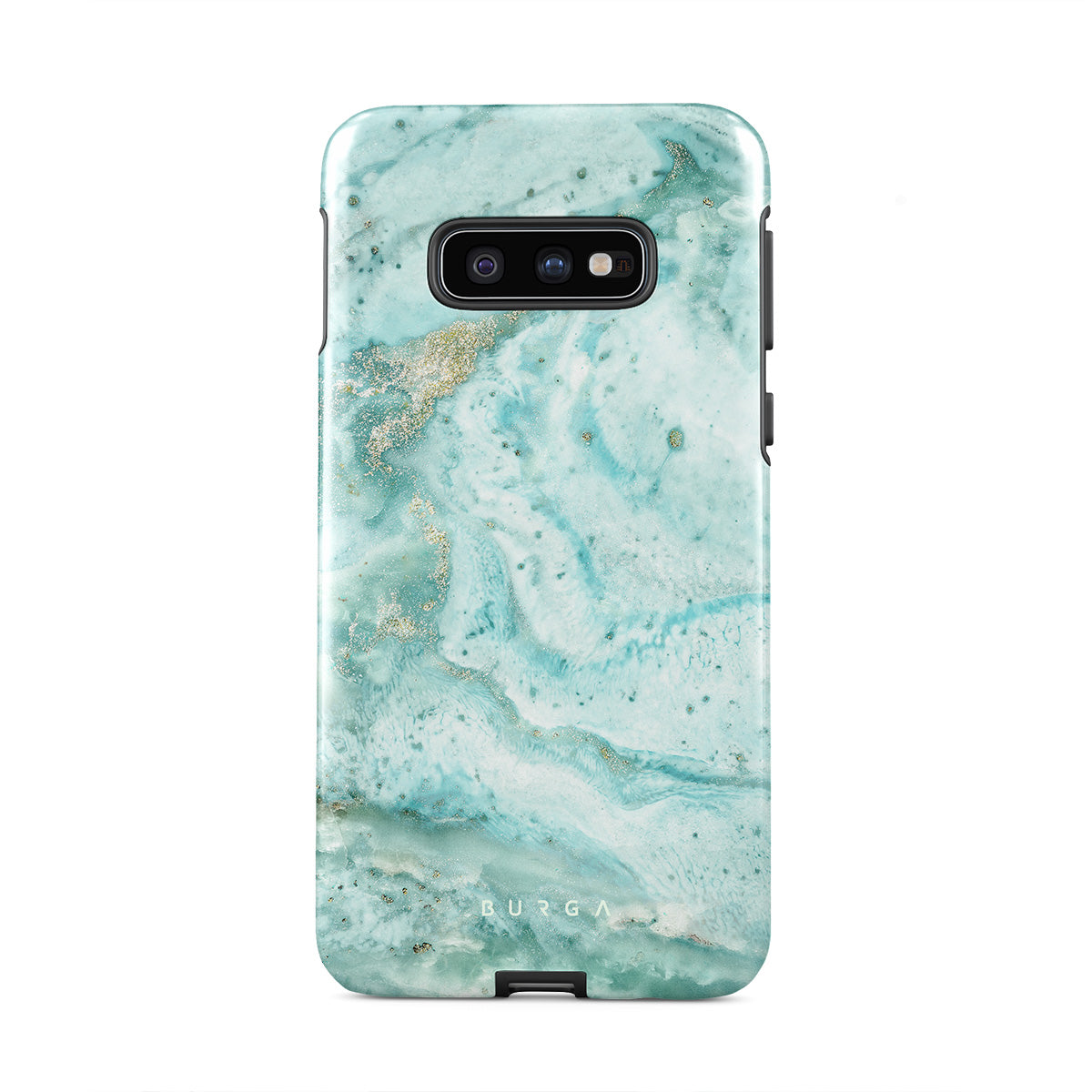 Our Uluwatu Waves Samsung Galaxy S10E phone case is an absolute teal dream. This phone cover features timeless and soft blue marble pattern enriched with golden color specks will surely remind you of a tropical beach teal waters while becoming a protective best friend for your cell phone.