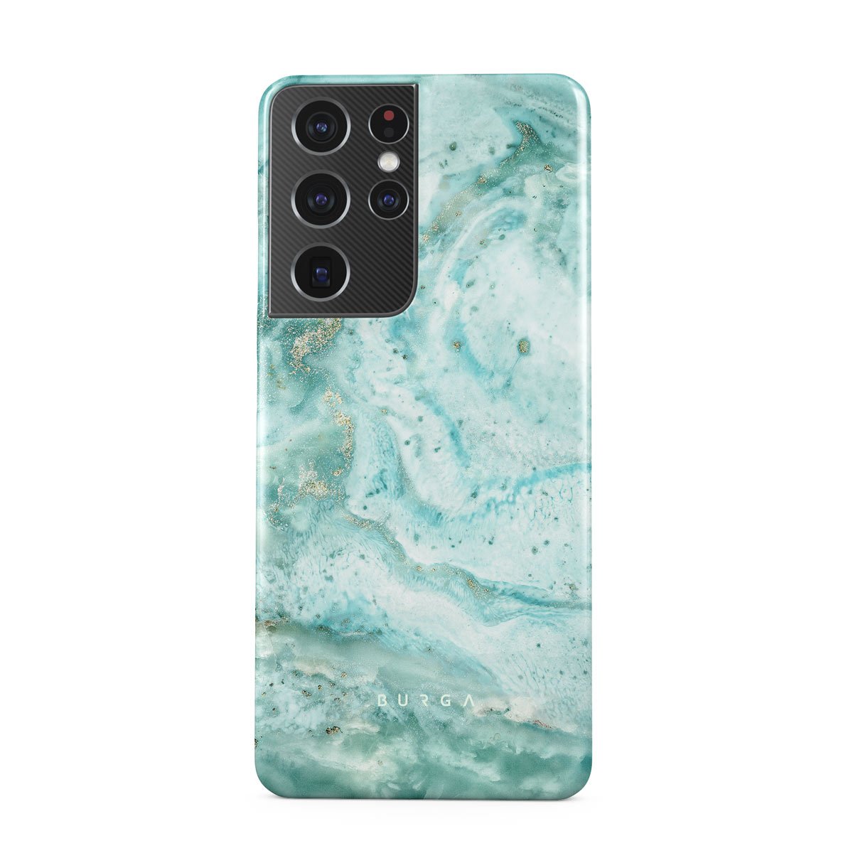 Our Uluwatu Waves Samsung Galaxy S21 Ultra phone case is an absolute teal dream. This phone cover features timeless and soft blue marble pattern enriched with golden color specks will surely remind you of a tropical beach teal waters while becoming a protective best friend for your cell phone.