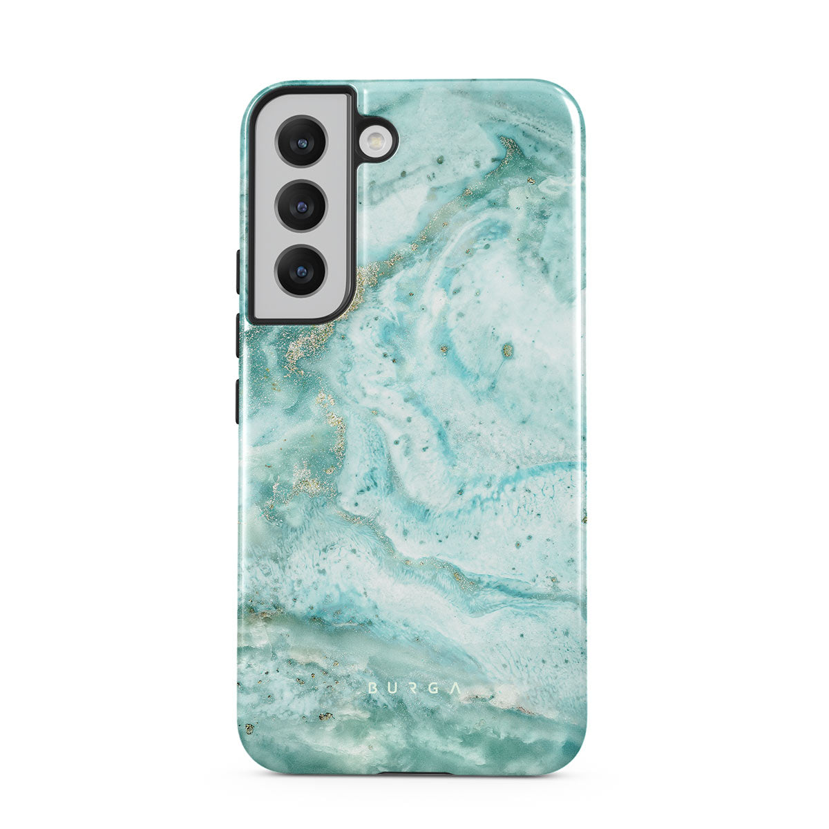 Our Uluwatu Waves Samsung Galaxy S22 phone case is an absolute teal dream. This phone cover features timeless and soft blue marble pattern enriched with golden color specks will surely remind you of a tropical beach teal waters while becoming a protective best friend for your cell phone.