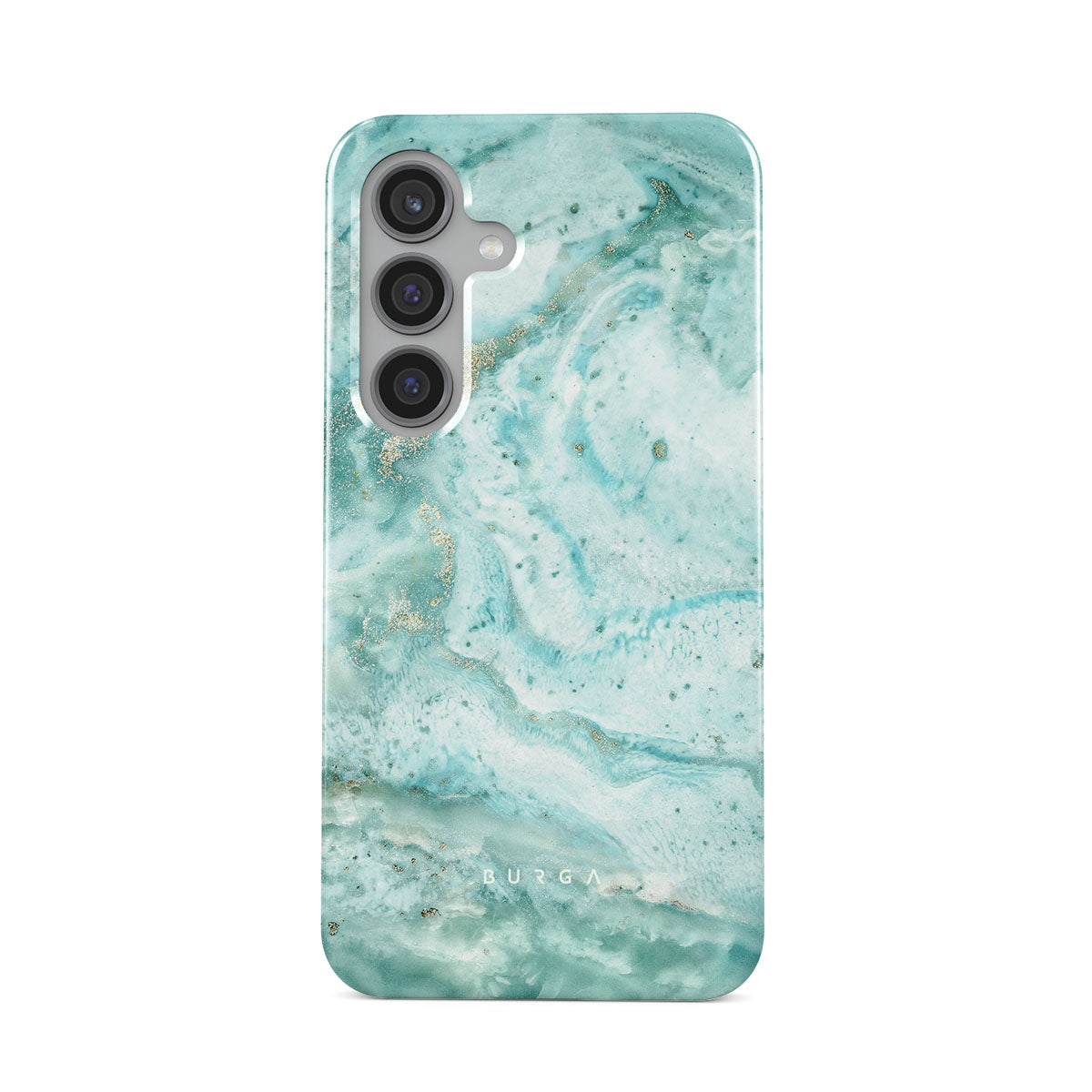Our Uluwatu Waves Samsung Galaxy S24 FE phone case is an absolute teal dream. This phone cover features timeless and soft blue marble pattern enriched with golden color specks will surely remind you of a tropical beach teal waters while becoming a protective best friend for your cell phone.