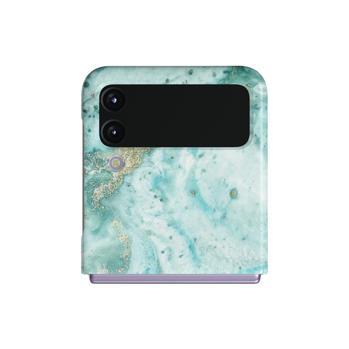 Our Uluwatu Waves Samsung Galaxy Z Flip 4 phone case is an absolute teal dream. This phone cover features timeless and soft blue marble pattern enriched with golden color specks will surely remind you of a tropical beach teal waters while becoming a protective best friend for your cell phone.