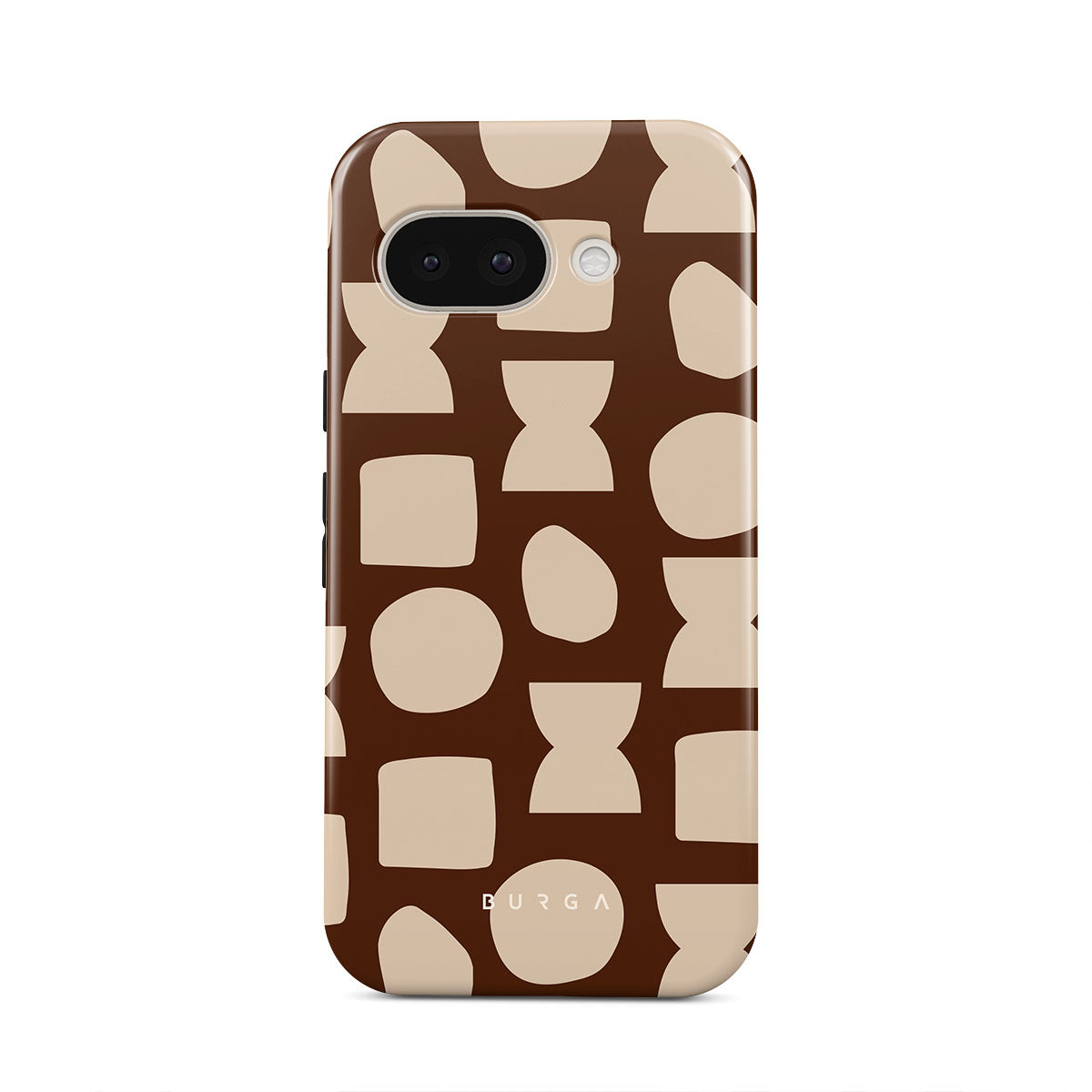 Our Terracotta Google Pixel 9a phone case design whispers warmth and grounded energy. Against a rich brown background, an interplay of light shapes unfolds, captivating the eye with an array of circles, squares, and hourglasses. Each shape is a testament to the beauty found in simplicity.