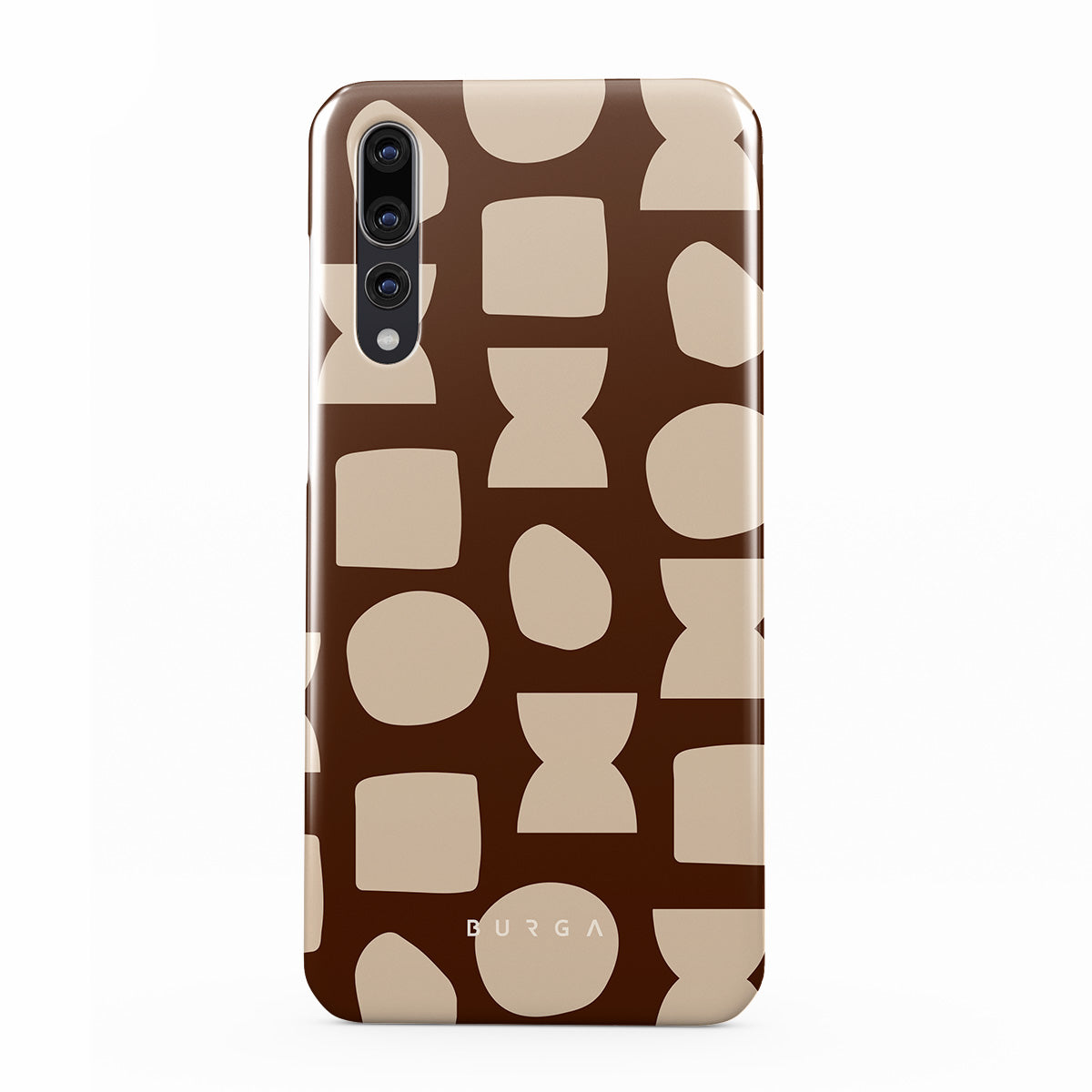 Our Terracotta Huawei P20 phone case design whispers warmth and grounded energy. Against a rich brown background, an interplay of light shapes unfolds, captivating the eye with an array of circles, squares, and hourglasses. Each shape is a testament to the beauty found in simplicity.