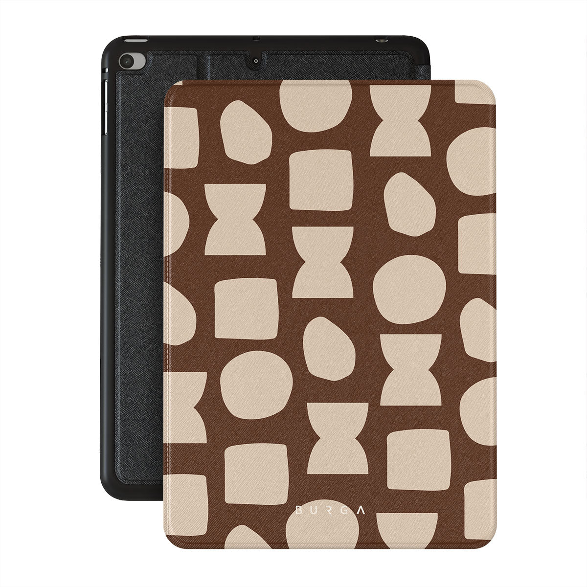 Our Terracotta iPad Mini 7.9 (5th Gen) folio case design whispers warmth and grounded energy. Against a rich brown background, an interplay of light shapes unfolds, captivating the eye with an array of circles, squares, and hourglasses. Each shape is a testament to the beauty found in simplicity.