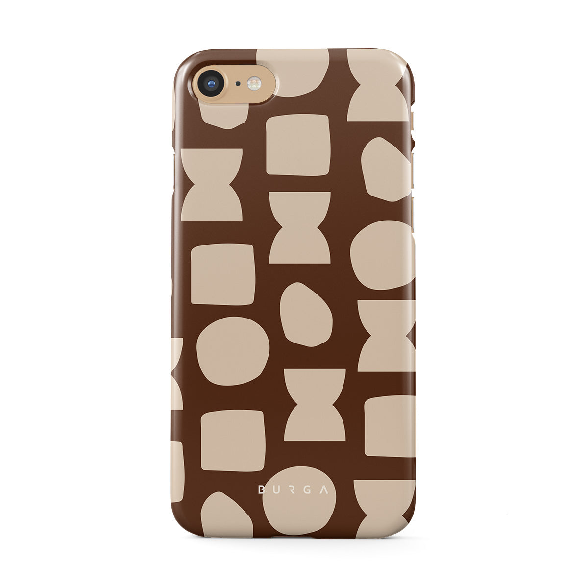 Our Terracotta iPhone SE (2020) phone case design whispers warmth and grounded energy. Against a rich brown background, an interplay of light shapes unfolds, captivating the eye with an array of circles, squares, and hourglasses. Each shape is a testament to the beauty found in simplicity.