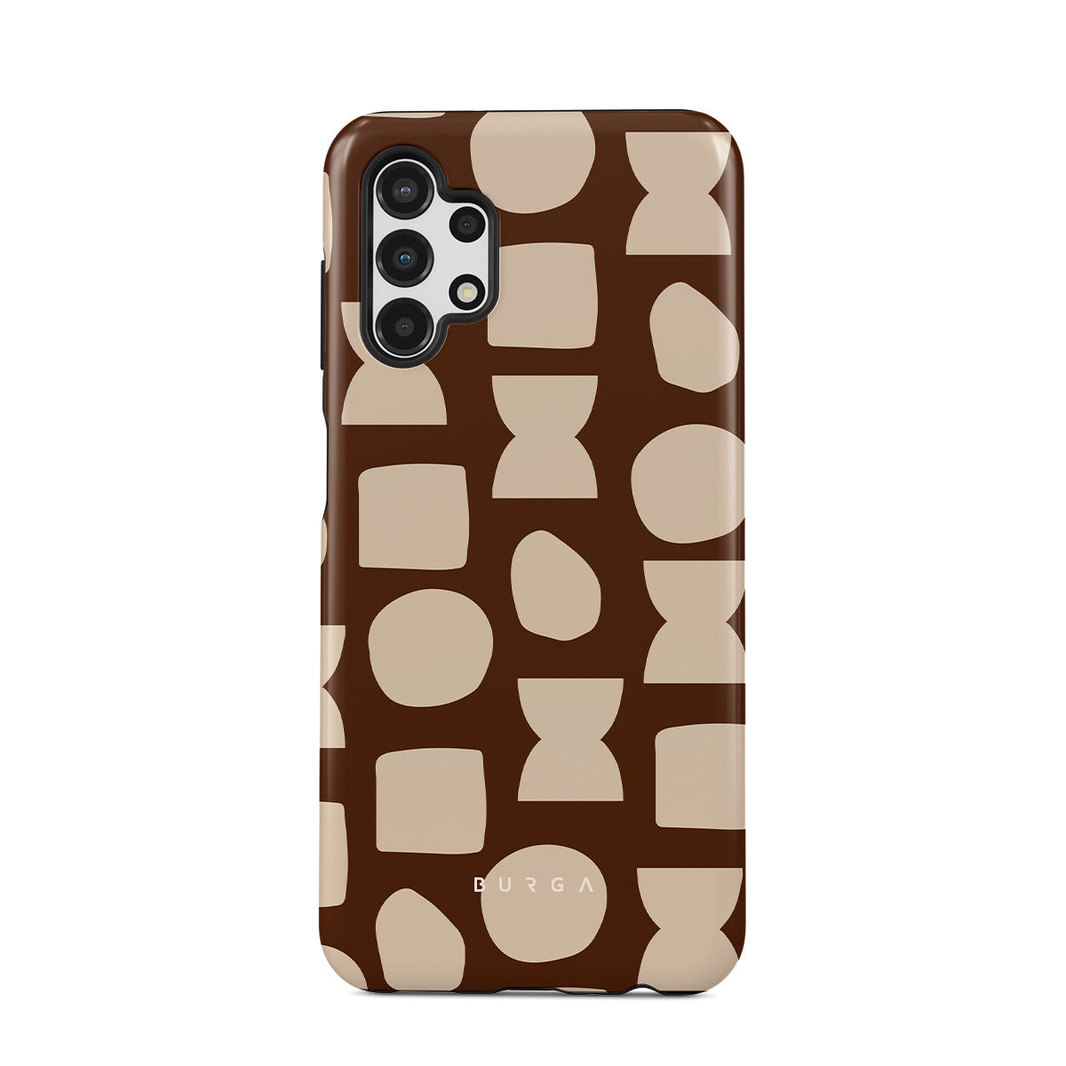 Our Terracotta Samsung Galaxy A13 4G phone case design whispers warmth and grounded energy. Against a rich brown background, an interplay of light shapes unfolds, captivating the eye with an array of circles, squares, and hourglasses. Each shape is a testament to the beauty found in simplicity.