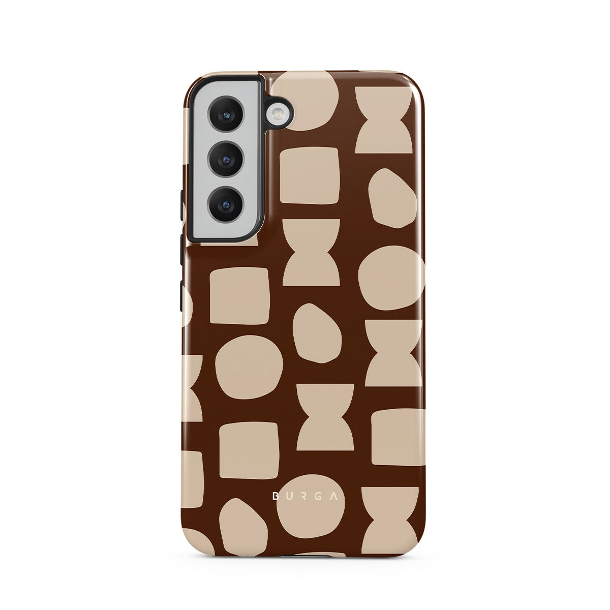 Our Terracotta Samsung Galaxy S22 Plus phone case design whispers warmth and grounded energy. Against a rich brown background, an interplay of light shapes unfolds, captivating the eye with an array of circles, squares, and hourglasses. Each shape is a testament to the beauty found in simplicity.