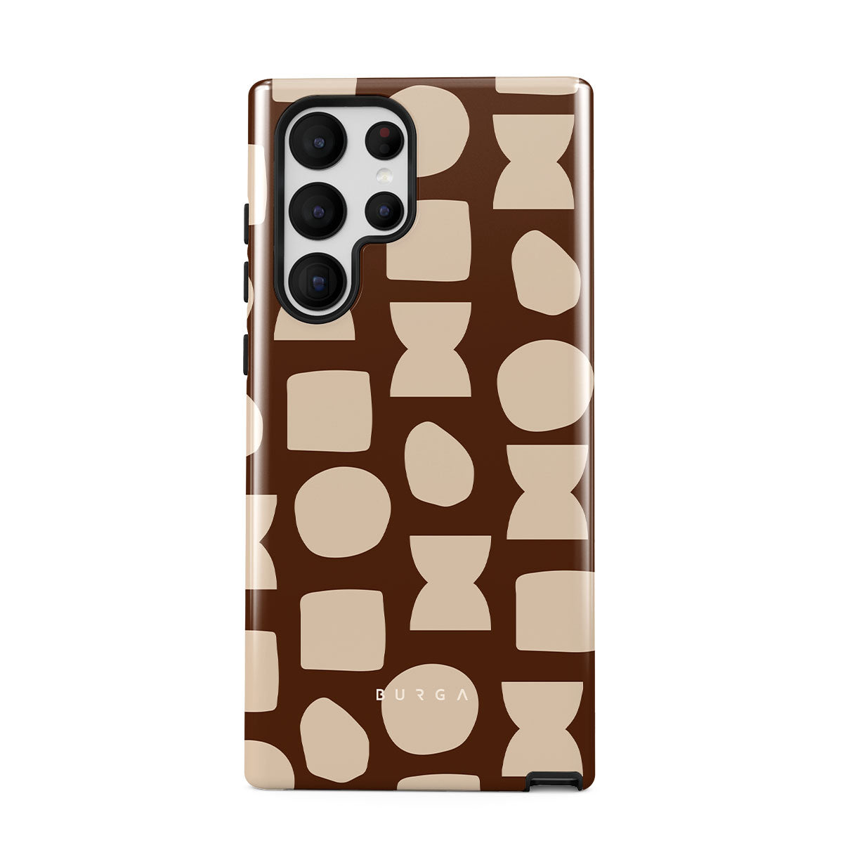 Our Terracotta Samsung Galaxy S22 Ultra phone case design whispers warmth and grounded energy. Against a rich brown background, an interplay of light shapes unfolds, captivating the eye with an array of circles, squares, and hourglasses. Each shape is a testament to the beauty found in simplicity.