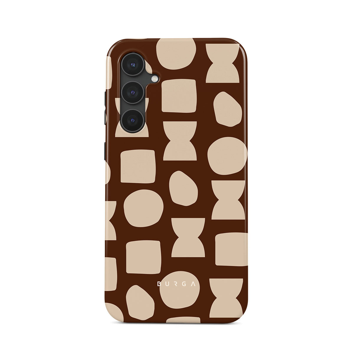 Our Terracotta Samsung Galaxy S23 FE phone case design whispers warmth and grounded energy. Against a rich brown background, an interplay of light shapes unfolds, captivating the eye with an array of circles, squares, and hourglasses. Each shape is a testament to the beauty found in simplicity.
