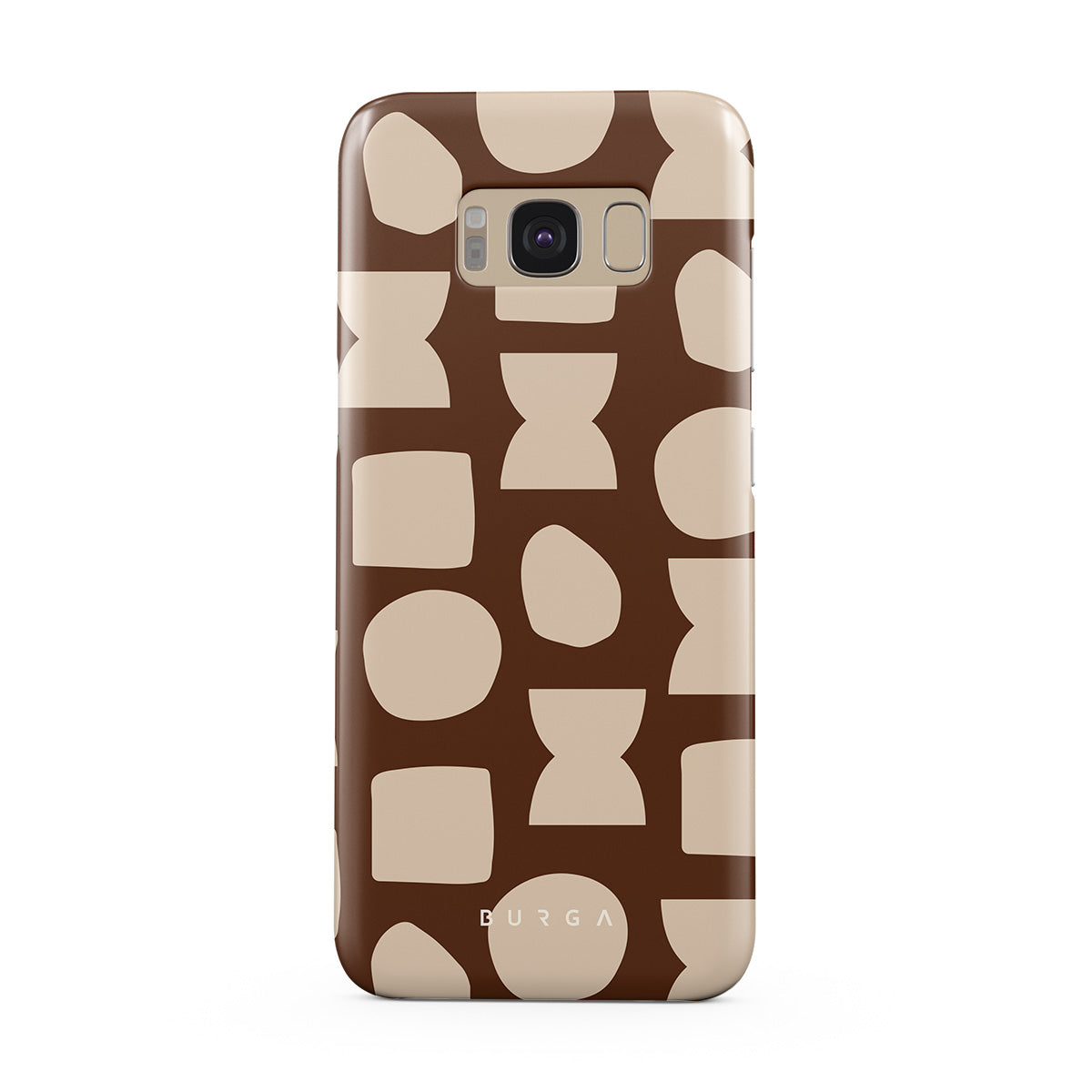 Our Terracotta Samsung Galaxy S8 phone case design whispers warmth and grounded energy. Against a rich brown background, an interplay of light shapes unfolds, captivating the eye with an array of circles, squares, and hourglasses. Each shape is a testament to the beauty found in simplicity.