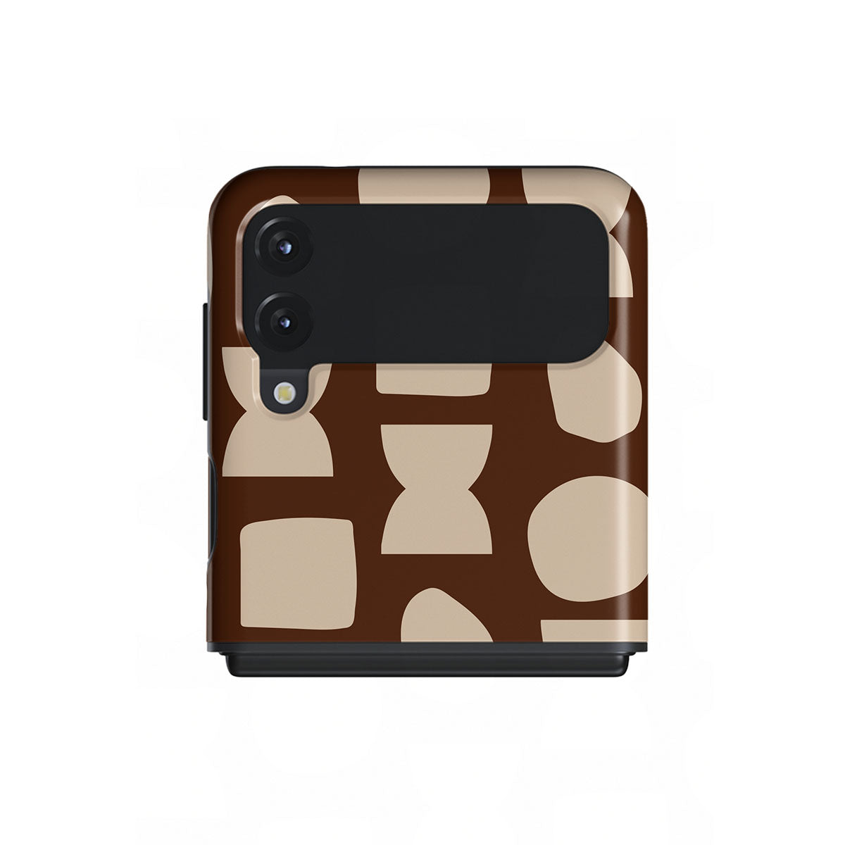 Our Terracotta Samsung Galaxy Z Flip 3 phone case design whispers warmth and grounded energy. Against a rich brown background, an interplay of light shapes unfolds, captivating the eye with an array of circles, squares, and hourglasses. Each shape is a testament to the beauty found in simplicity.