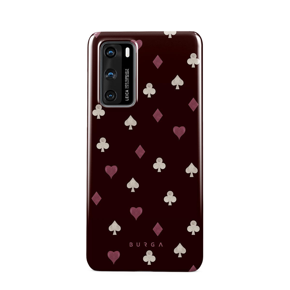 Nothing is as it appears. Hearts, clubs, diamonds, and spades—stacked in your favor or playing against you? This Huawei P40 phone case design features a rich burgundy background and minimalist suits that make for a game where the rules are constantly shifting.