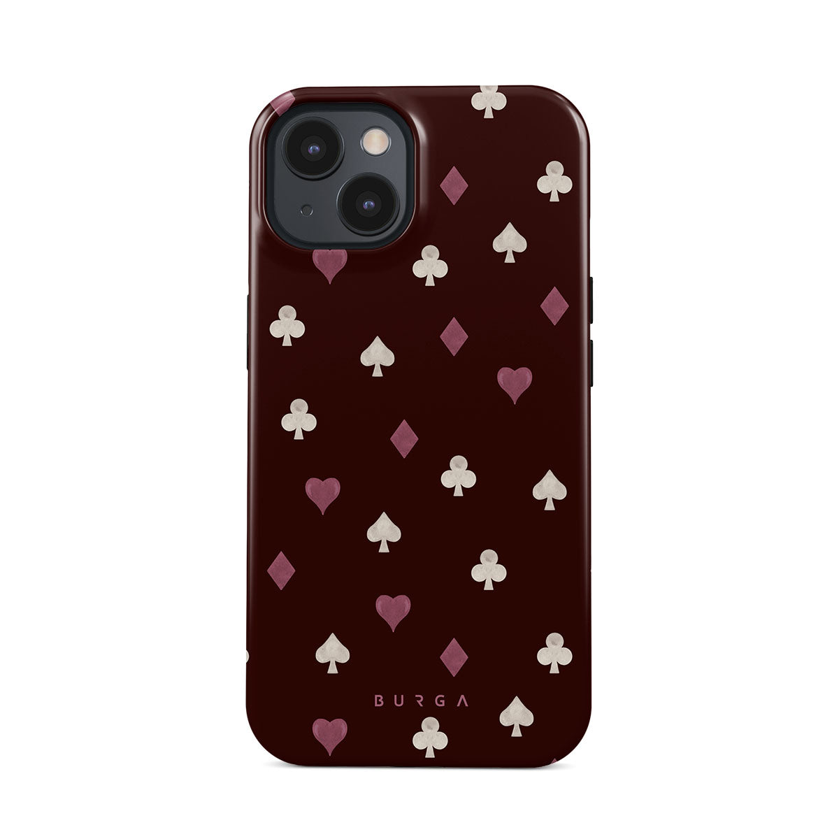 Nothing is as it appears. Hearts, clubs, diamonds, and spades—stacked in your favor or playing against you? This iPhone 15 Plus phone case design features a rich burgundy background and minimalist suits that make for a game where the rules are constantly shifting.