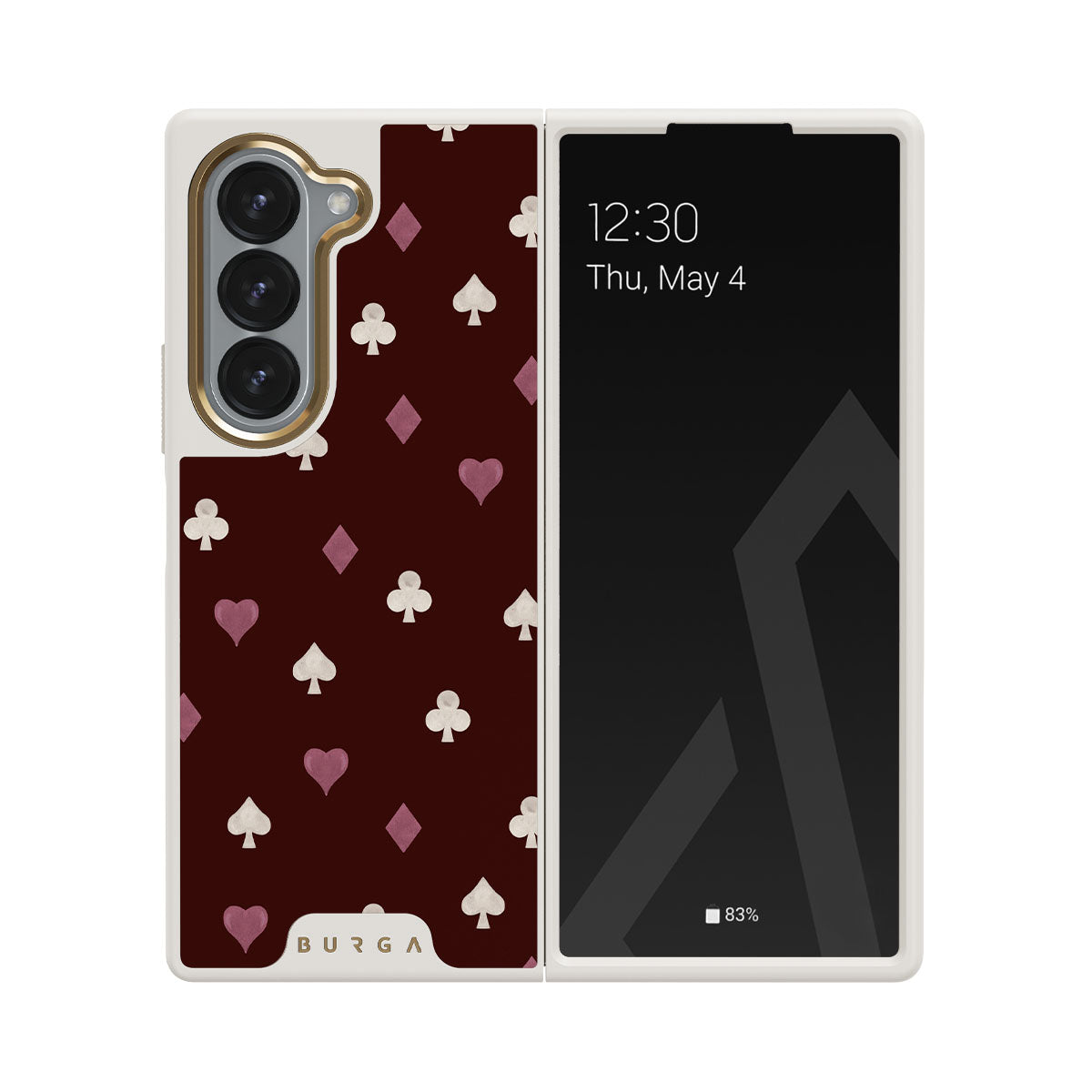 Nothing is as it appears. Hearts, clubs, diamonds, and spades—stacked in your favor or playing against you? This Samsung Galaxy Z Fold 6 phone case design features a rich burgundy background and minimalist suits that make for a game where the rules are constantly shifting.