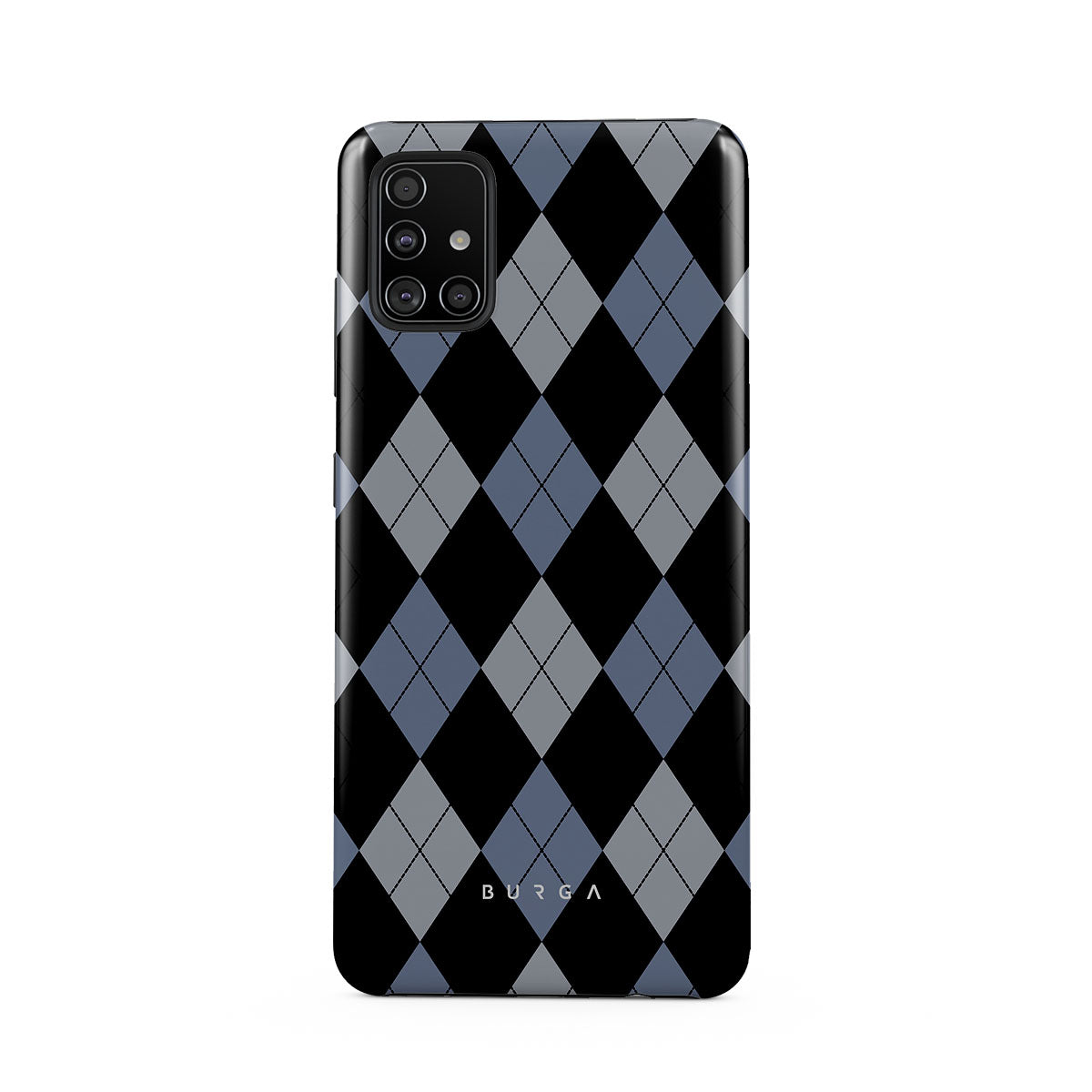 Discover our Trouble Samsung Galaxy A51 4G phone case design—a classic argyle pattern featuring stark black diamonds that seamlessly blend with two distinct shades of blue. Made for those who respect the classics but aren't afraid to disrupt the norm.