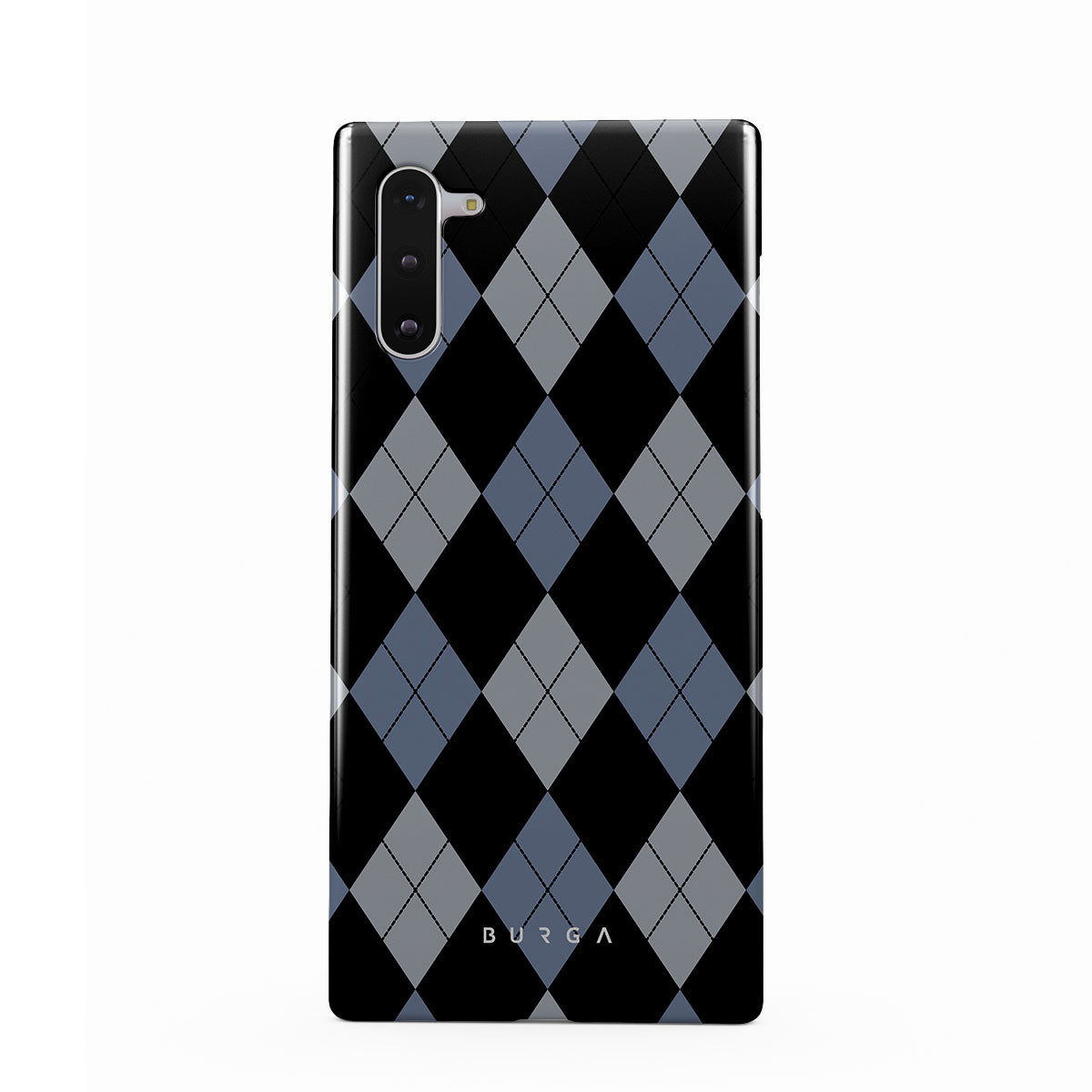 Discover our Trouble Samsung Galaxy Note 10 phone case design—a classic argyle pattern featuring stark black diamonds that seamlessly blend with two distinct shades of blue. Made for those who respect the classics but aren't afraid to disrupt the norm.