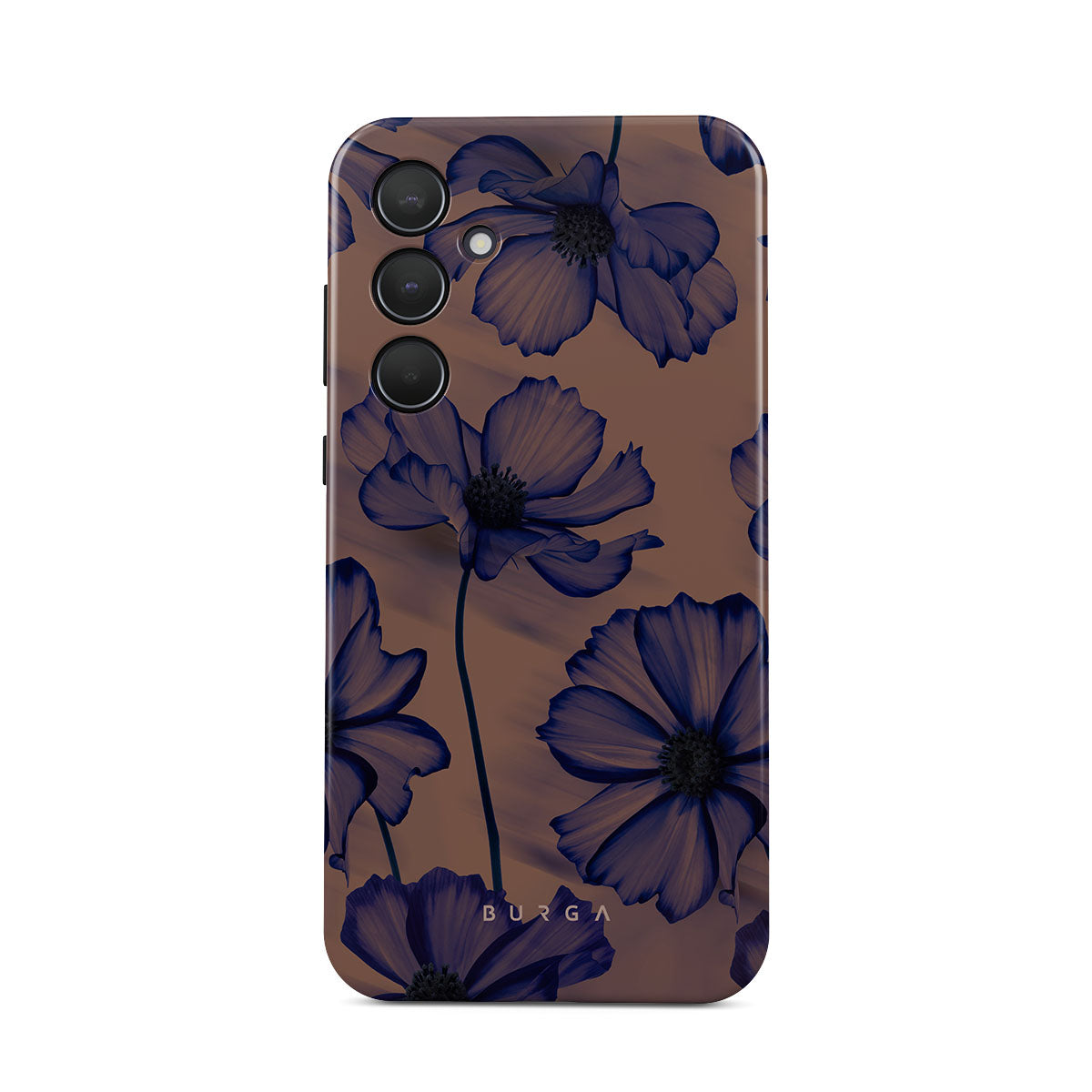 Discover our Velvet Night design. On a soft nude backdrop, blue poppies dance in the untamed rhythm of the wind. A blend of night's peace and daring energy, this Samsung Galaxy A35 phone case is perfect for those who dream big and seek adventure.