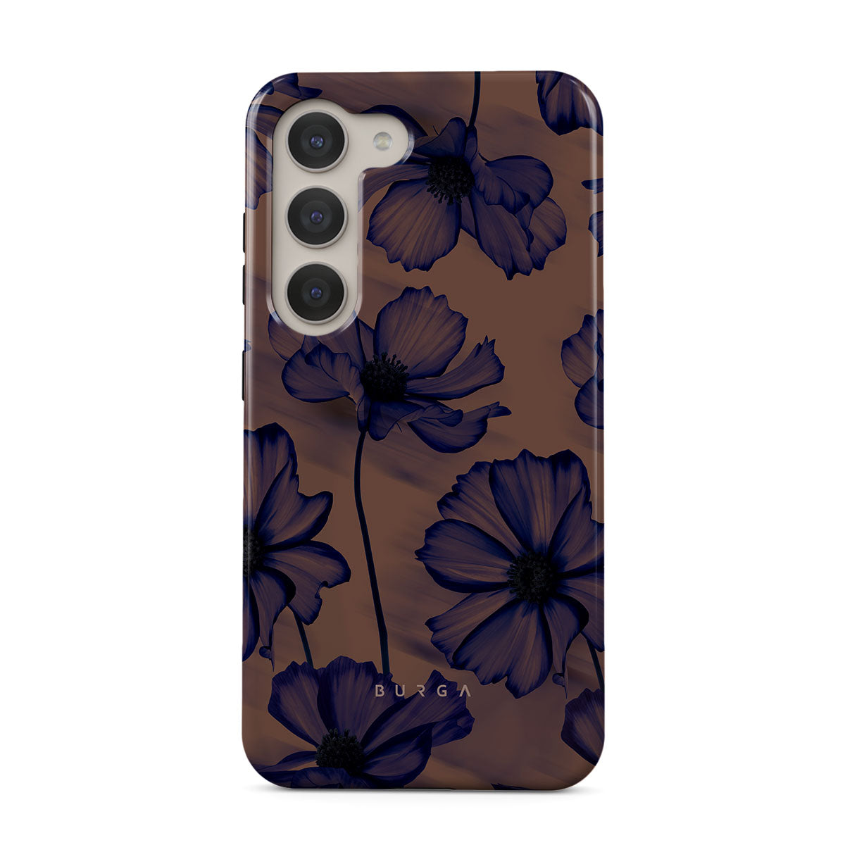 Discover our Velvet Night design. On a soft nude backdrop, blue poppies dance in the untamed rhythm of the wind. A blend of night's peace and daring energy, this Samsung Galaxy S23 phone case is perfect for those who dream big and seek adventure.