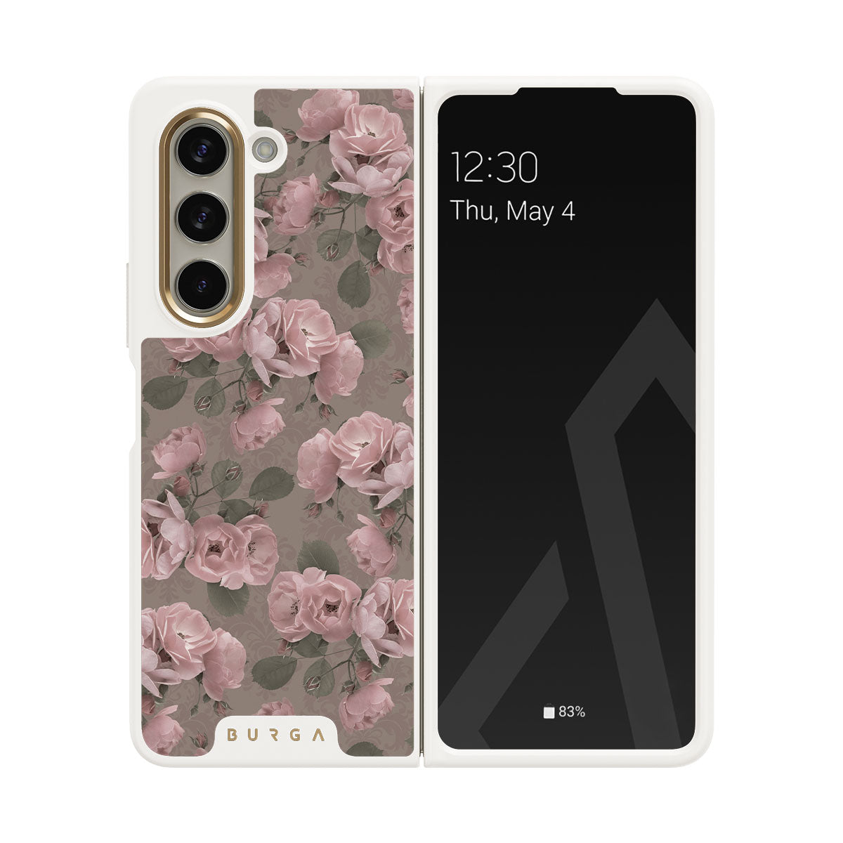 Blush, blooming roses transport you to an era of silent film stars and secret gardens. Our sophisticated Vintage Glamour Samsung Galaxy Z Fold 5 phone case design is perfect for the romantic at heart. It's for those who speak in glances and sighs and find comfort in the nostalgic whispers of floral romance.