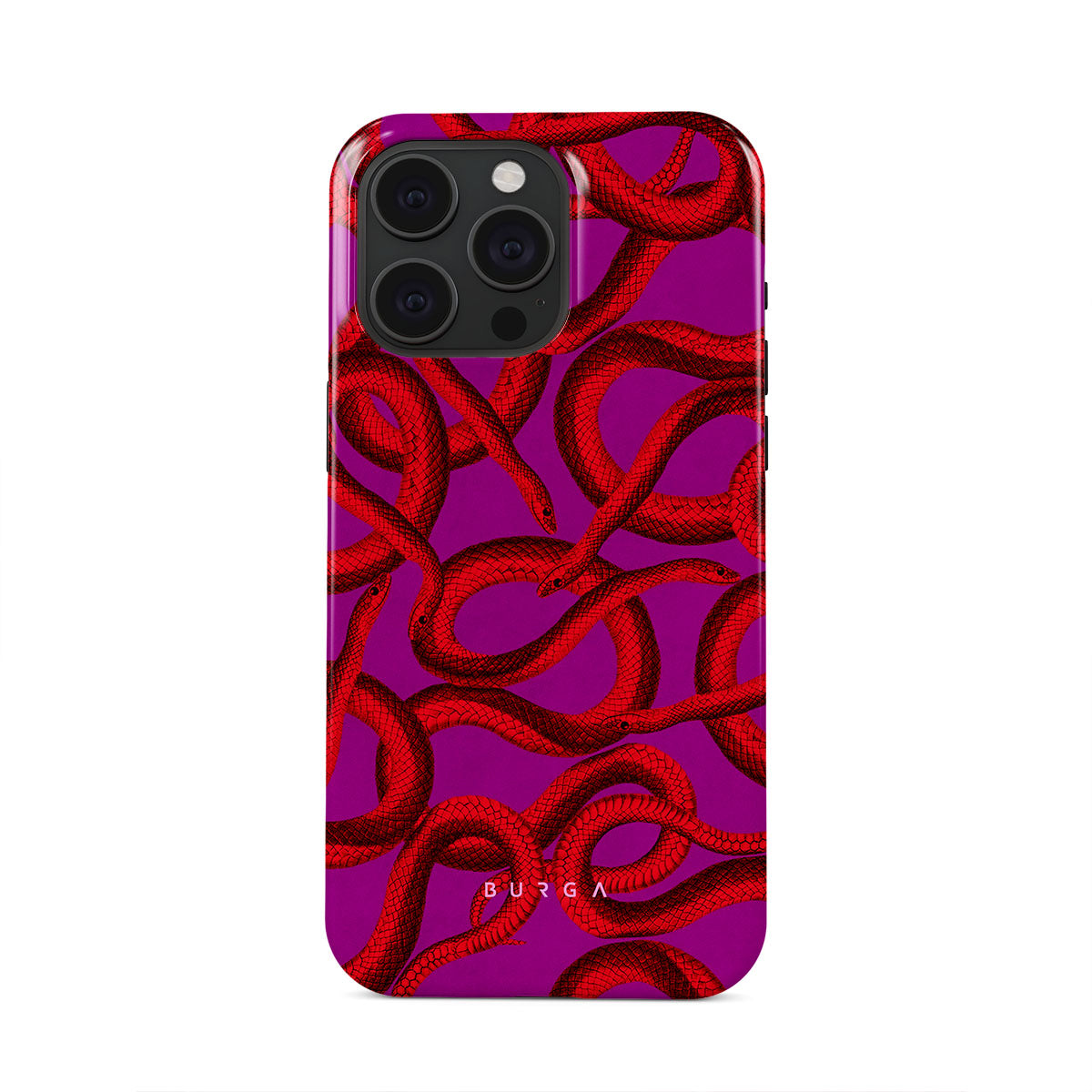Watch Out iPhone 15 Pro phone case design offers a fierce feel with a bright magenta colored background covered in red snakes pattern. Make a statement while protecting your phone, as this case is guaranteed to catch everyone's eye.