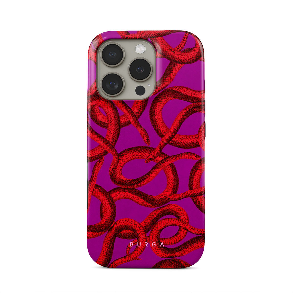 Watch Out iPhone 16 Pro Max phone case design offers a fierce feel with a bright magenta colored background covered in red snakes pattern. Make a statement while protecting your phone, as this case is guaranteed to catch everyone's eye.